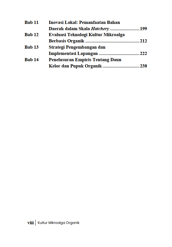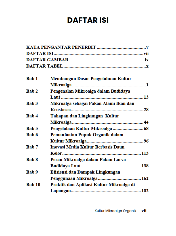 Berikut Daftar Isi Buku Perikanan yang berjudul Buku Kultur Mikroalga Organik: Teknologi Tepat Guna untuk Budidaya Laut Berkelanjutan, diantaranya: