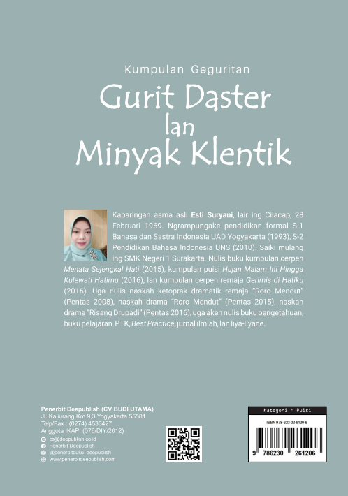 Buku Kumpulan Geguritan Gurit Daster lan Minyak Klentik ini diterbitkan oleh Penerbit Buku Pendidikan Deepublish.
