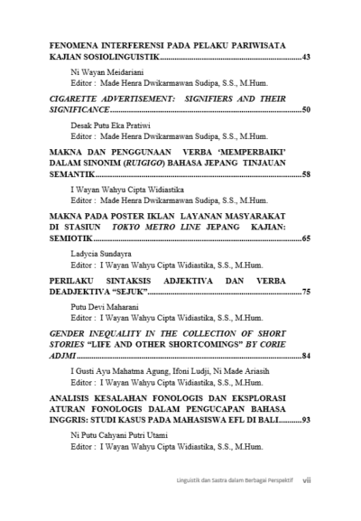 Buku Linguistik Dan Sastra Dalam Berbagai Perspektif Buku Bahasa dan Sastra berjudul Linguistik Dan Sastra Dalam Berbagai Perspektif merupakan karya Anak Agung Ayu Dian Andriyani, dkk. Buku ini merupakan upaya bersama untuk menjelajahi dan mengungkapkan ragam aspek yang menarik dalam dua bidang ilmu yang begitu kaya dan mendalam: linguistik dan sastra. Artikel-artikel yang terhimpun dalam buku ini mencerminkan keberagaman pemikiran dan pendekatan ilmiah di dalam dunia linguistik dan sastra. Mulai dari eksplorasi mendalam tentang struktur bahasa hingga analisis kritis terhadap karya sastra klasik dan kontemporer, setiap artikel memberikan wawasan yang berharga dan memperkaya pemahaman kita tentang keindahan dan kompleksitas bahasa serta karya sastra. Melalui keberagaman artikel yang terdapat di dalamnya, buku ini diharapkan dapat merangsang pemikiran, memicu diskusi ilmiah, dan memberikan sumbangan positif bagi perkembangan kedua bidang ini. Semoga buku ini juga dapat menjadi pijakan bagi penelitian lebih lanjut dan menjadi jembatan bagi pemahaman yang lebih dalam tentang linguistik dan sastra. Berikut Daftar Isi Buku Bahasa dan Sastra berjudul Buku Linguistik Dan Sastra Dalam Berbagai Perspektif, diantaranya: