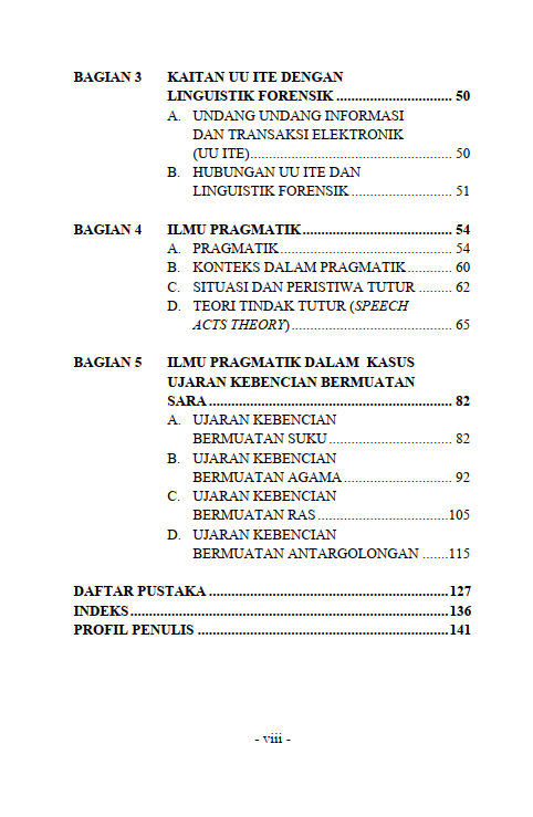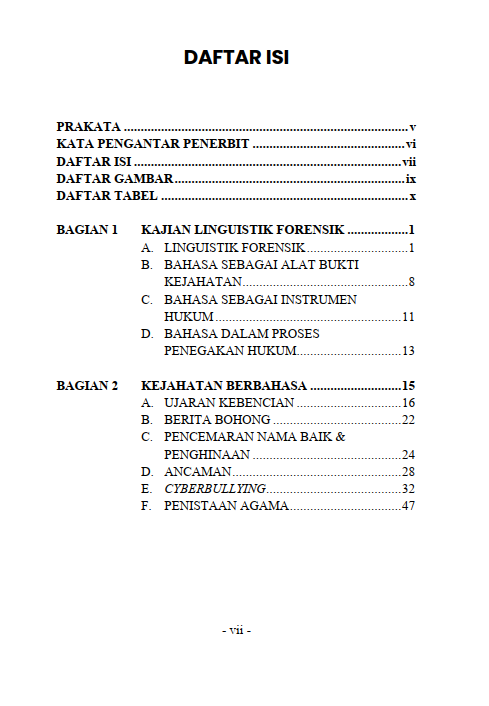 Berikut Daftar Isi Buku Hukum yang berjudul Buku Linguistik Forensik Penerapan Ilmu Pragmatik dalam Kajian Linguistik Forensik (Dilengkapi dengan Contoh & Analisis Kasus), diantaranya: