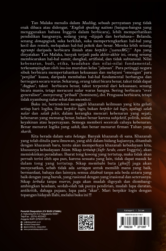 Kita hidup dalam satu belanga, belanga Islam. Khazanah yang ada, ditambah dengan khazanah baru, pasti akan memperkaya khazanah kebudayaan kita, khususnya kebudayaan Islam. Sikap tertutup (kufr: Arab; cover: Inggris), akan memiskinkan ilmu dan budaya. Ibarat tong kosong yang tertutup, maka tidak akan pernah terisi oleh apa pun, karena “sesuatu” yang lain, tidak dapat masuk ke dalam tong yang tertutup. Sikap membabi buta (ghulf) juga akan menyesatkan, sebab tidak memiliki saringan untuk memilih mana yang benar, baik, bermanfaat, bahaya dan lainnya; semuanya ditabrak tanpa bisa membedakan antara yang benar dengan yang salah, yang baik dengan yang buruk, yang rasional dengan yang tidak rasional, dan seterusnya. Sikap terbuka tanpa reserve, akan mudah digoyang dan diombang-ambingkan keadaan, karena tidak punya pendirian, patokan, sehingga mudah lupa daratan, terbang saat dipuja, menjilat saat “dahaga”, lupa “akar”, saat diterjang “badai”. Yang dituntut adalah berfikir kritis, tidak menerima begitu saja, taken for granted, rasional, sesuai dengan tatanan nalar sehat, bukan nalar sesat, agar menemukan kebenaran. Buku ini menggali khazanah keilmuan yang sering kita geluti setiap hari: logika. Ilmu tentang berfikir logis, berfikir sehat, bukan berpikir irasional, dan tak waras (RR), apalagi salah nalar, salah pikir. Sebuah discovery, dalam kerangka mencari kebenaran yang sejati, kebenaran yang memang benar, bukan benar karena subjektivitas pribadi, kelompok, suku, politik, keyakinan atau kepercayaan. Memanfaatkan karya-karya yang telah ditulis para ilmuwan, yang ahli dalam bidang kajiannya, semoga buku ini memberi secercah cahaya kebenaran.