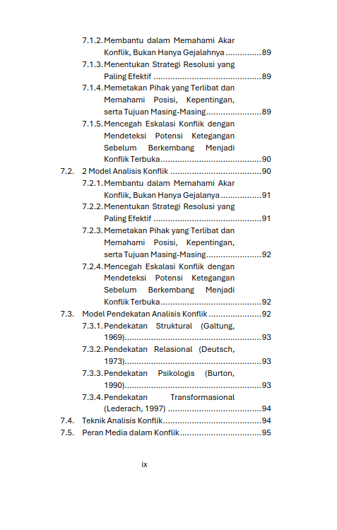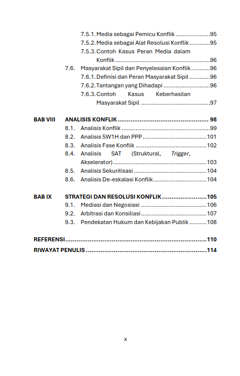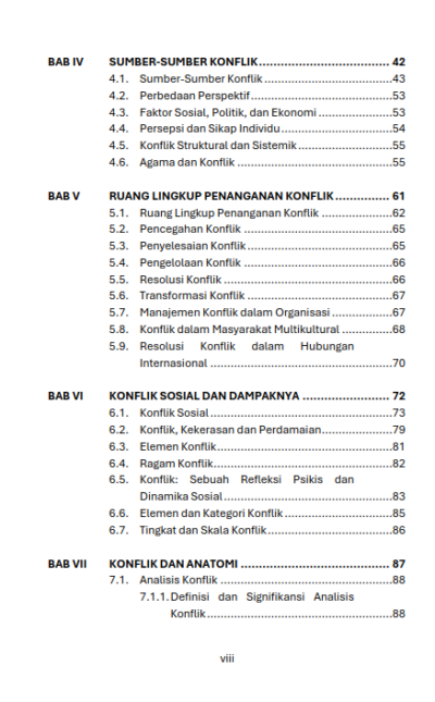 Dalam konteks sosial, konflik sering kali diperburuk oleh ketimpangan sosial-ekonomi, yang merupakan jurang antara kelompok kaya dan miskin. Ketimpangan ini tidak hanya menciptakan kecemburuan sosial, tetapi juga menjadi penyebab utama konflik horizontal. Misalnya, dalam masyarakat pedesaan, kurangnya lapangan kerja sering kali menjadi pemicu utama konflik sosial. Dalam situasi ini, pemerintah dan masyarakat perlu bekerja sama untuk menciptakan kebijakan yang mengurangi ketimpangan dan menciptakan peluang bagi semua lapisan masyarakat. Buku ini ditulis untuk memberikan wawasan yang mendalam tentang pengelolaan konflik, baik dari segi teori maupun praktik. Secara komprehensif, buku ini mengintegrasikan berbagai pandangan tentang konflik, mulai dari prinsip-prinsip dasar, teori penyebab, hingga sumber-sumber konflik yang paling sering terjadi.