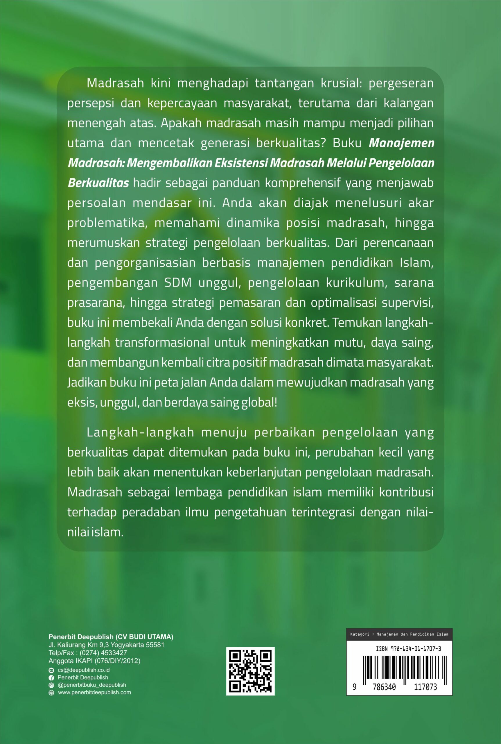 Buku Manajemen Madrasah: Mengembalikan Eksistensi Madrasah Melalui Pengelolaan Berkualitas diterbitkan oleh Penerbit Buku Pendidikan Deepublish.