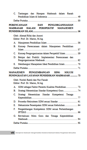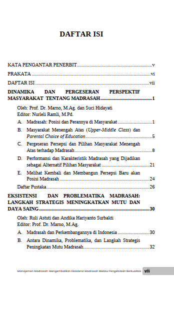 Madrasah kini menghadapi tantangan krusial: pergeseran persepsi dan kepercayaan masyarakat, terutama dari kalangan menengah atas. Apakah madrasah masih mampu menjadi pilihan utama dan mencetak generasi berkualitas? Buku Manajemen Madrasah: Mengembalikan Eksistensi Madrasah Melalui Pengelolaan Berkualitas hadir sebagai panduan komprehensif yang menjawab persoalan mendasar ini. Anda akan diajak menelusuri akar problematika, memahami dinamika posisi madrasah, hingga merumuskan strategi pengelolaan berkualitas. Dari perencanaan dan pengorganisasian berbasis manajemen pendidikan Islam, pengembangan SDM unggul, pengelolaan kurikulum, sarana prasarana, hingga strategi pemasaran dan optimalisasi supervisi, buku ini membekali Anda dengan solusi konkret. Temukan langkah-langkah transformasional untuk meningkatkan mutu, daya saing, dan membangun kembali citra positif madrasah di mata masyarakat. Jadikan buku ini peta jalan Anda dalam mewujudkan madrasah yang eksis, unggul, dan berdaya saing global!