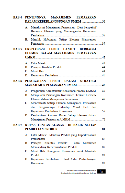Sinopsis Buku Manajemen Pemasaran Kuliner Strategi Jitu Menaklukkan Pasar Kuliner Buku Manajemen Pemasaran Kuliner Strategi Jitu Menaklukkan Pasar Kuliner Buku Manajemen yang berjudul Buku Manajemen Pemasaran Kuliner Strategi Jitu Menaklukkan Pasar Kuliner merupakan karya Muhammad Rizki. Dewasa ini, pertumbuhan UMKM di Indonesia melesat pesat hingga berkontribusi besar dalam perekonomian nasional. Meskipun jumlah UMKM yang terbentuk terus bertambah, tetapi fenomena ini tidak diiringi dengan kesadaran para pelaku usaha akan pentingnya sebuah manajemen pemasaran. Minimnya pengetahuan mereka tentang strategi pemasaran yang efektif mengakibatkan produk mereka sulit bersaing di pasar yang semakin kompetitif ini. Berangkat dari fenomena yang ada, buku ini hadir sebagai gambaran bagi para pelaku UMKM pentingnya memahami dan menerapkan manajemen pemasaran secara efektif. Buku ini mengupas tuntas berbagai elemen penting dalam manajemen pemasaran, mulai dari membangun citra merek yang kuat, meningkatkan persepsi kualitas produk, hingga strategi memengaruhi minat beli dan keputusan pembelian. Selain itu, buku ini juga menguraikan hubungan setiap elemen dalam mewujudkan UMKM yang berkelanjutan. Buku ini diharapkan dapat menjadi sumber referensi bagi para pelaku UMKM agar lebih siap bersaing di pasar yang dinamis dan meningkatkan daya saing produk sampai terwujudnya usaha yang berkelanjutan. Buku Manajemen Pemasaran Kuliner Strategi Jitu Menaklukkan Pasar Kuliner sangat cocok bagi para peneliti, mahasiswa, dan praktisi di bidang pemasaran juga manajemen bisnis tentang pemahaman yang mendalam terhadap strategi pemasaran yang tepat akan menjadi pembeda antara usaha yang sekadar ada dengan usaha yang mampu tumbuh secara berkelanjutan. Berikut Daftar Isi Buku Manajemen yang berjudul Buku Manajemen Pemasaran Kuliner Strategi Jitu Menaklukkan Pasar Kuliner, diantaranya: