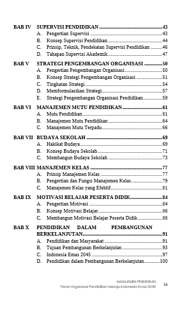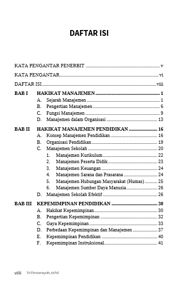 Sinopsis Buku Manajemen Pendidikan Peran Organisasi Pendidikan Menuju Indonesia Emas 2045 Buku Manajemen Pendidikan Peran Organisasi Pendidikan Menuju Indonesia Emas 2045 Buku Pendidikan berjudul Buku Manajemen Pendidikan Peran Organisasi Pendidikan Menuju Indonesia Emas 2045 merupakan karya Tri Firmansyah. Indonesia saat ini tengah berfokus pada upaya mencapai Tujuan Pembangunan Berkelanjutan (SDGs) dan Visi Indonesia Emas 2045. Salah satu tantangan besar yang dihadapi adalah kualitas pendidikan. Hasil survei internasional seperti PISA menunjukkan bahwa kualitas pendidikan di Indonesia masih jauh dari harapan. Masalah seperti relevansi kurikulum, kualitas guru, dan kesenjangan akses pendidikan masih menjadi persoalan yang berulang. Untuk mengatasi masalah ini, diperlukan perbaikan menyeluruh dalam sistem pendidikan, terutama di tingkat sekolah. Sekolah sebagai unit pendidikan paling dasar memiliki peran yang sangat penting dalam mewujudkan visi pendidikan nasional. Oleh karena itu, pengelolaan sekolah harus dilakukan secara efektif dan efisien. Penerapan prinsip-prinsip manajemen dalam organisasi sekolah dapat membantu meningkatkan kinerja seluruh komponen sekolah, mulai dari guru, siswa, hingga orang tua. Buku ini hadir untuk memberikan referensi bagi para pengelola sekolah dalam menerapkan manajemen pendidikan. Dengan menguasai konsep-konsep manajemen, sekolah dapat menciptakan lingkungan belajar yang kondusif, meningkatkan kualitas pembelajaran, dan mencapai tujuan pendidikan nasional. Berikut Daftar Isi Buku Pendidikan berjudul Buku Manajemen Pendidikan Peran Organisasi Pendidikan Menuju Indonesia Emas 2045, diantaranya: