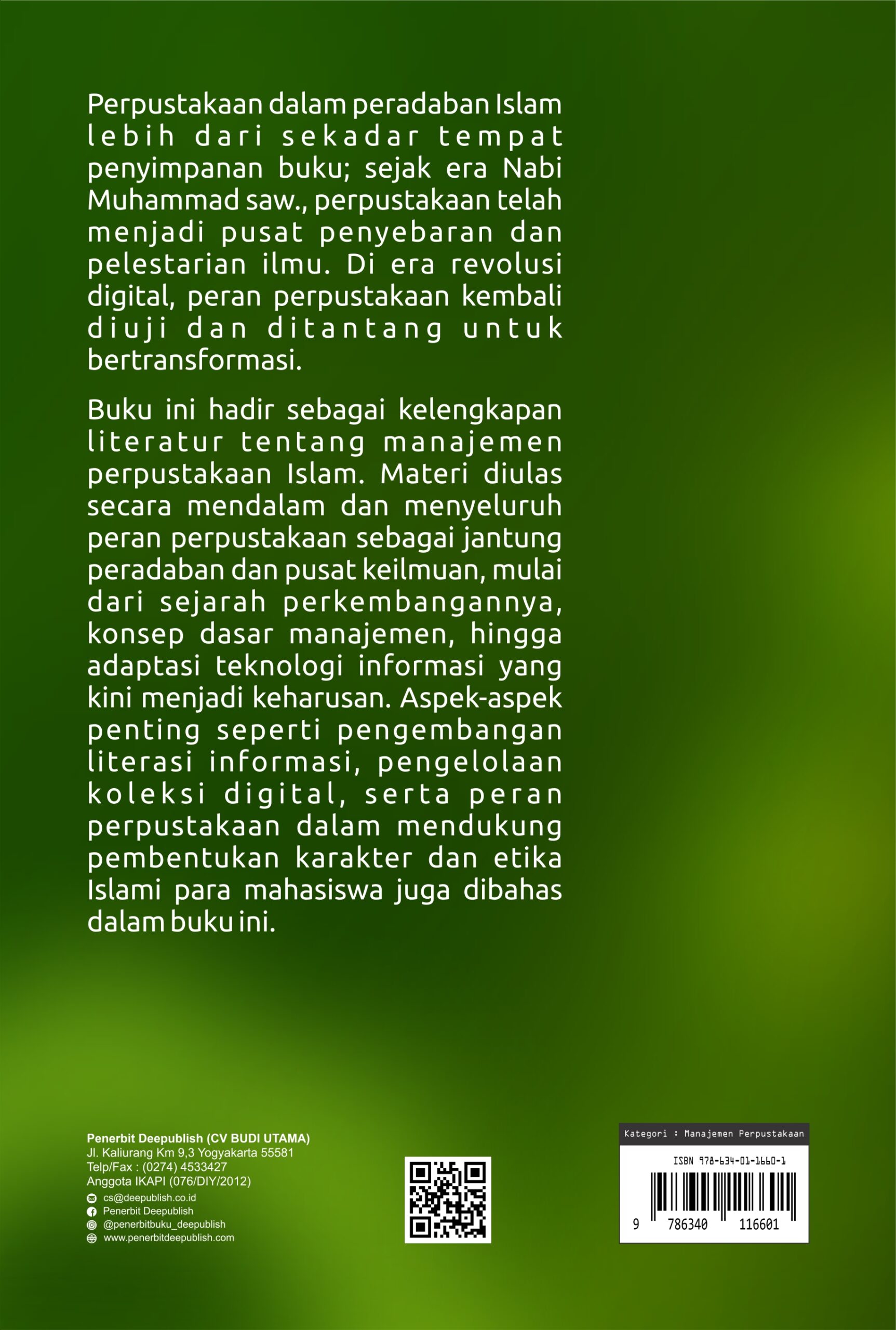 Buku Manajemen Perpustakaan Islam Teori, Strategi, dan Inovasi dalam Era Digital diterbitkan oleh Penerbit Buku Pendidikan Deepublish.