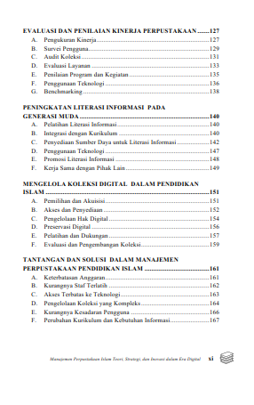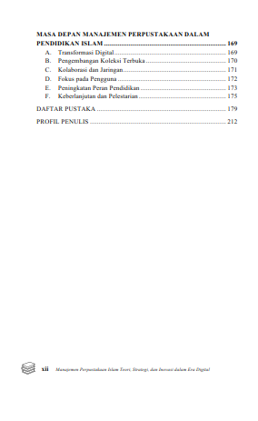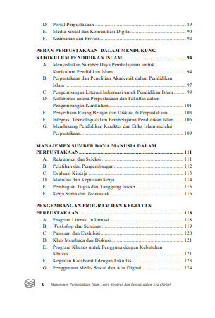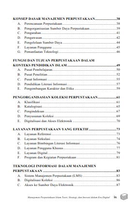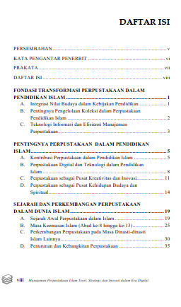 Berikut Daftar Isi Buku Perpustakaan yang berjudul Buku Manajemen Perpustakaan Islam Teori, Strategi, dan Inovasi dalam Era Digital, diantaranya: