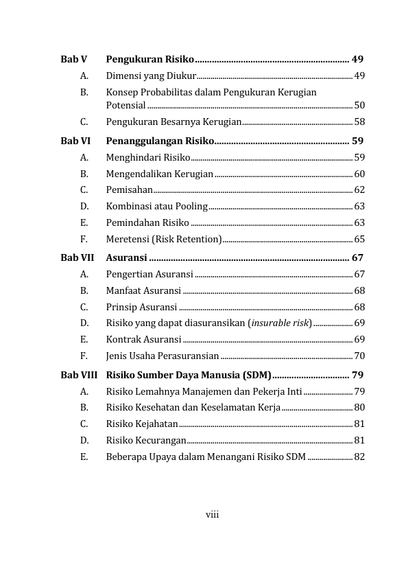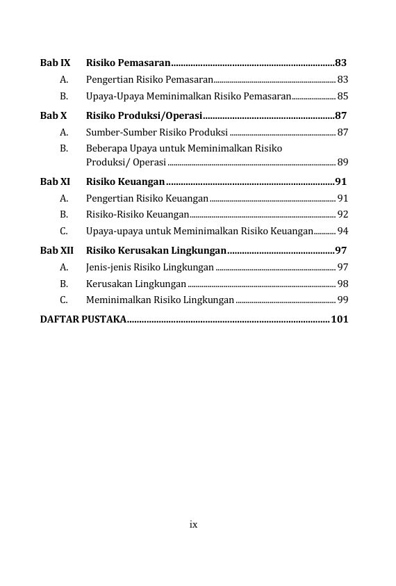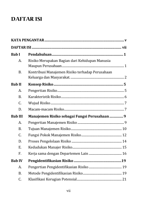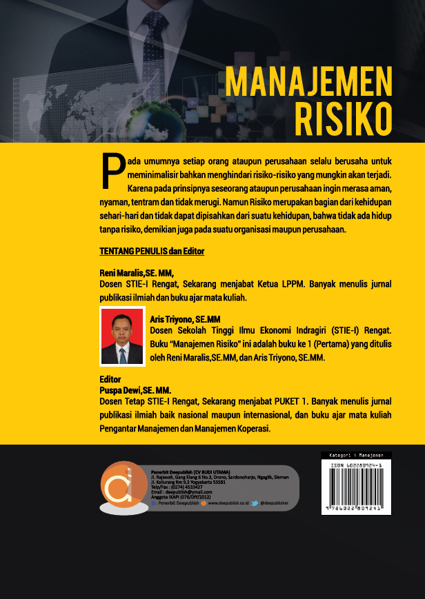 Sinopsis Buku Manajemen Risiko Buku Manajemen Risiko Pada umumnya setiap orang ataupun perusahaan selalu berusaha untuk meminimalisir bahkan menghindari risiko-risiko yang mungkin akan terjadi. Karena pada prinsipnya seseorang ataupun perusahaan ingin merasa aman, nyaman, tentram dan tidak merugi. Namun Risiko merupakan bagian dari kehidupan sehari-hari dan tidak dapat dipisahkan dari suatu kehidupan, bahwa tidak ada hidup tanpa risiko, demikian juga pada suatu organisasi maupun perusahaan. Perusahaan sebagai lembaga bisnis, sama halnya juga dengan manusia, berada dalam suatu lingkungan yang penuh dengan ketidakpastian. Berbagai faktor dari lingkungan, baik itu konsumen, perantara, pesaing, pemerintah, dan faktor lingkungan lainnya akan memberikan pengaruh kepada perusahaan baik pengaruh yang positif berarti memberikan peluang atau dorongan, atau pengaruh yang negatif, berarti memberikan hambatan atau ancaman kepada perusahaan. Selanjutnya ketika pengaruhnya positif atau negatif, sejauh mana pengaruh positif atau negatif tersebut kepada perusahaan. Semua itu tentu harus diperhatikan, dianalisis dan didiagnosis, namun tetap saja ketidak pastian itu tidak bisa kita ubah 100% menjadi sesuatu yang pasti. Hanya dengan perhatian yang memadai, melalui analisis dan diagnosis yang tepat diharapkan manajemen perusahaan akan bisa memprediksi lebih tepat kemungkinan risiko yang terjadi, sehingga akan dapat meminimalkan kerugian dari resiko tersebut bila hal-hal yang tidak diharapkan terjadi, karena sudah diprediksi sebelumnya dan disiapkan antisipasinya. Pada gilirannya ketika semua perusahaan telah menerapkan manajemen risiko yang baik, setiap individu juga menerapkan manajemen risiko yang baik maka pada gilirannya masyarakat secara keseluruhan terhindar atau dapat meminimalkan kerugian dari risiko-risiko yang merugikan, pada akhirnya masayarakat pun akan meningkat kesejahteraannya. Manajemen Risiko sangat cocok bagi para peneliti, mahasiswa, dan praktisi di bidang bisnis dan manajemen. Berikut Daftar Isi Buku Manajemen Risiko, diantaranya: