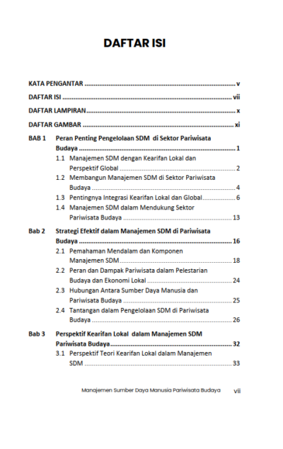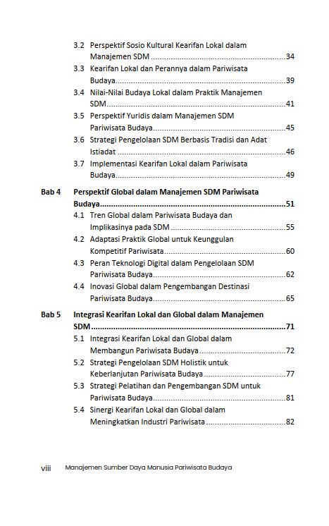 Sinopsis Buku Manajemen Sumber Daya Manusia Pariwisata Budaya: Perspektif Kearifan Lokal Dan Global Buku Manajemen Sumber Daya Manusia Pariwisata Budaya: Perspektif Kearifan Lokal Dan Global Buku Pariwisata yang berjudul Buku Manajemen Sumber Daya Manusia Pariwisata Budaya: Perspektif Kearifan Lokal Dan Global merupakan karya Irene Hanna H. Sihombing dan Dewa Komang Tantra. Industri pariwisata budaya menghadapi tantangan besar di era globalisasi. Di satu sisi, pariwisata budaya menawarkan potensi besar untuk melestarikan tradisi dan meningkatkan kesejahteraan masyarakat lokal. Di sisi lain, meningkatnya ekspektasi global terhadap standar pelayanan memerlukan strategi pengelolaan SDM yang adaptif, inovatif, dan berorientasi pada kualitas. Namun, literatur yang membahas sinergi antara kearifan lokal dan pendekatan global dalam konteks manajemen SDM pariwisata budaya masih sangat terbatas. Banyak publikasi cenderung berfokus pada salah satu aspek saja, sehingga kurang memberikan pandangan holistik yang mencakup kedua perspektif tersebut. Tantangan globalisasi dalam pengelolaan SDM mendorong destinasi pariwisata budaya untuk memenuhi standar global tanpa mengorbankan keaslian budaya. Buku ini disajikan dengan menawarkan pendekatan holistik dengan menggabungkan teori, strategi, dan praktik terbaik yang relevan dalam pengelolaan SDM pariwisata budaya. Dengan fokus pada pelestarian nilai-nilai lokal sekaligus adaptasi terhadap dinamika global, buku ini diharapkan dapat menjadi referensi penting dalam mengembangkan SDM yang unggul, kompeten, dan berkelanjutan. Berikut Daftar Isi Buku Pariwisata yang berjudul Buku Manajemen Sumber Daya Manusia Pariwisata Budaya: Perspektif Kearifan Lokal Dan Global, diantaranya: