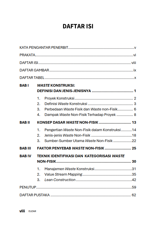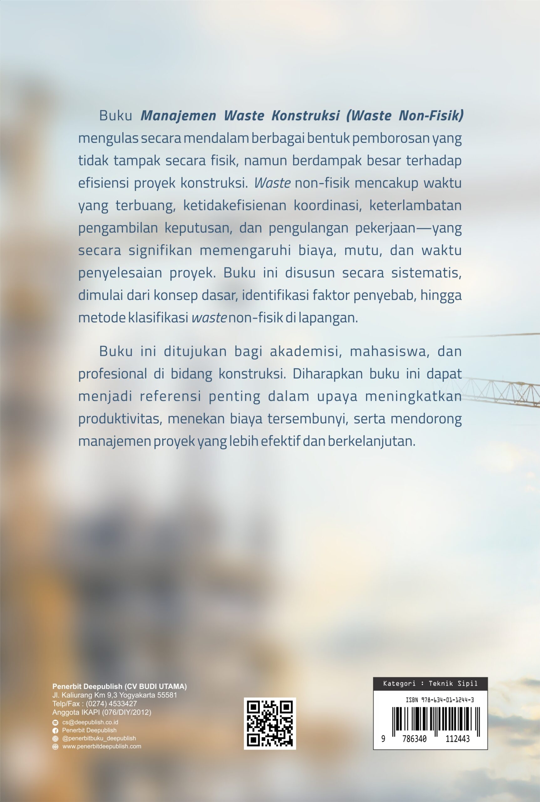 Sinopsis Buku Manajemen Waste Konstruksi (Waste Non-Fisik) Buku Manajemen Waste Konstruksi (Waste Non-Fisik) Stop kerugian akibat ‘waste non-fisik’ yang merajalela di proyek konstruksi Anda! Kini hadir panduan sistematis untuk mengidentifikasi dan menghilangkan pemborosan waktu, koordinasi buruk, hingga rework yang selama ini menguras keuntungan. Buku Teknik Sipil yang berjudul Buku Manajemen Waste Konstruksi (Waste Non-Fisik) merupakan karya Elizar. Proyek konstruksi merupakan kegiatan yang kompleks, melibatkan berbagai sumber daya seperti tenaga kerja, material, peralatan, waktu, dan dana yang dikelola secara simultan. Dalam pelaksanaannya, efisiensi dan efektivitas manajemen menjadi kunci utama untuk mencapai tujuan proyek dalam hal mutu, biaya, dan waktu. Waste non-fisik dalam konstruksi mencakup waste yang tidak berwujud material, seperti waktu terbuang akibat menunggu keputusan, koordinasi yang buruk antara pihak-pihak proyek, pengulangan pekerjaan (rework), kurangnya kejelasan informasi, serta proses birokrasi yang berlarut-larut. Waste ini berdampak signifikan terhadap produktivitas dan performa proyek, namun sering kali tidak terukur dan tidak tertangani secara sistematis. Dalam banyak kasus, proyek mengalami keterlambatan dan pembengkakan biaya bukan karena kekurangan material, melainkan karena lemahnya manajemen terhadap waste non-fisik tersebut. Dalam praktik proyek konstruksi, perhatian seringkali lebih difokuskan pada limbah fisik seperti material sisa dan puing bangunan. Pada sisi lain, terdapat bentuk-bentuk waste yang tidak kasat mata seperti waktu yang terbuang, ketidakefisienan koordinasi, keterlambatan pengambilan keputusan, dan pengulangan pekerjaan—yang secara signifikan memengaruhi biaya, mutu, dan waktu penyelesaian proyek. Isu-isu ini dikategorikan sebagai waste non-fisik, yang perlu dikelola dengan pendekatan manajerial dan sistematis. Buku ini disusun secara sistematis, dimulai dari konsep dasar, identifikasi faktor penyebab, hingga metode klasifikasi waste non-fisik di lapangan. Buku Manajemen Waste Konstruksi (Waste Non-Fisik)i sangat cocok bagi bagi mahasiswa teknik sipil, dosen, peneliti, praktisi konstruksi, manajer proyek, serta pihak-pihak yang terlibat dalam proses perencanaan dan pelaksanaan proyek infrastruktur. Melalui buku ini, pembaca diharapkan dapat memahami jenis-jenis waste non-fisik, metode identifikasi dan analisisnya, serta strategi efektif dalam mengurangi dan mencegah waste tak terlihat tersebut dengan pendekatan Lean construction, manajemen mutu, serta penerapan teknologi. Berikut Daftar Isi Buku Teknik Sipil yang berjudul Buku Manajemen Waste Konstruksi (Waste Non-Fisik), diantaranya: