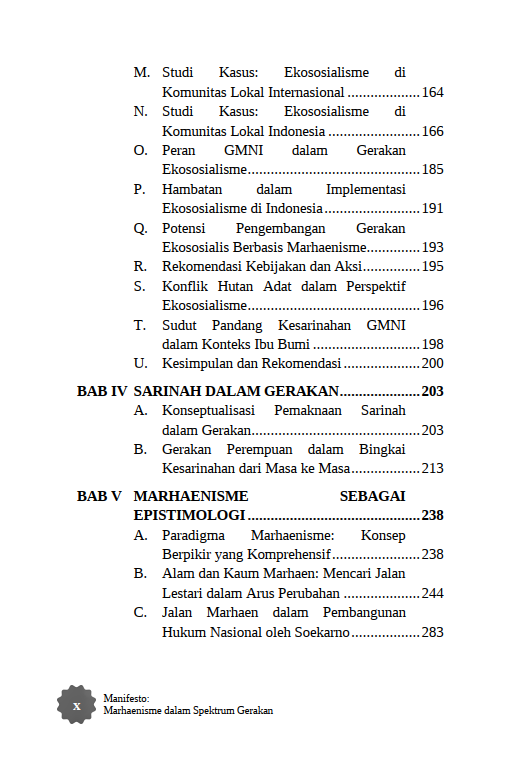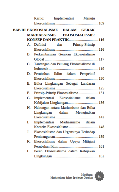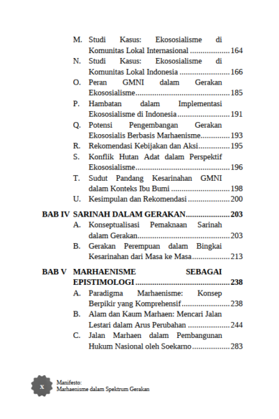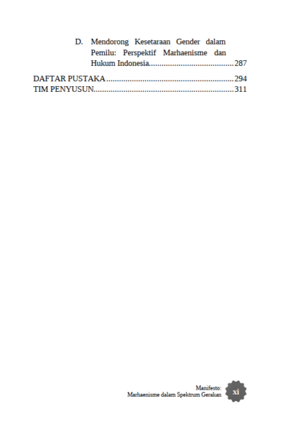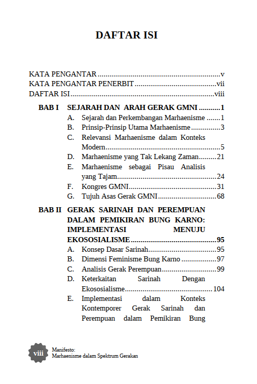 Berikut Daftar Isi Buku Sosial dan Politik yang berjudul Buku Manifesto: Marhaenisme dalam Spektrum Gerakan, diantaranya: