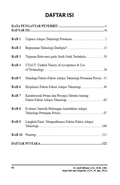 Melalui buku ini, kita akan bersama-sama menyoroti pentingnya adopsi teknologi pertanian presisi oleh petani. Termasuk juga membuktikan bahwa perilaku dan minat menuju teknologi modern ternyata meningkatkan kesejahteraan dan hasil pertanian. Tidak hanya itu, buku ini juga nantinya dapat memperluas perspektif (broadening perspective) dalam pengukuran farm size dan government social power, menguji kembali (replicating knowledge) pengaruh performance expectancy, effort expectancy, facilitating conditions dan social influence, farm size, government social power dan behavior intention to use terhadap use behavior, serta mendorong riset dan pengembangan lebih lanjut. Tentu saja dari hasil-hasil pendekatan eksperimental ini nantinya dapat menghasilkan alternatif model solusi dalam meningkatkan use behavior serta dapat dijadikan dasar pertimbangan bagi kalangan pertanian dalam memecahkan masalah yang sedang dihadapi petani.