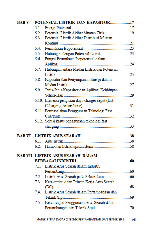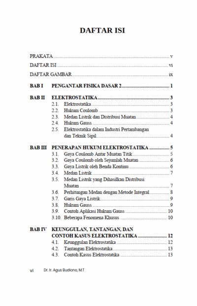 Berikut Daftar Isi Buku Fisika yang berjudul Buku Materi Fisika Dasar 2 Teknik Pertambangan dan Teknik Sipil, diantaranya: