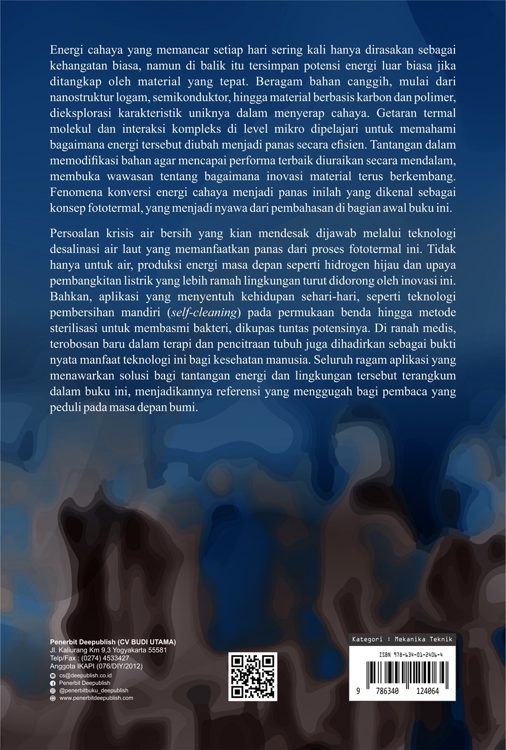 Persoalan krisis air bersih yang kian mendesak dijawab melalui teknologi desalinasi air laut yang memanfaatkan panas dari proses fototermal ini. Tidak hanya untuk air, produksi energi masa depan seperti hidrogen hijau dan upaya pembangkitan listrik yang lebih ramah lingkungan turut didorong oleh inovasi ini. Bahkan, aplikasi yang menyentuh kehidupan sehari-hari, seperti teknologi pembersihan mandiri (self-cleaning) pada permukaan benda hingga metode sterilisasi untuk membasmi bakteri, dikupas tuntas potensinya. Di ranah medis, terobosan baru dalam terapi dan pencitraan tubuh juga dihadirkan sebagai bukti nyata manfaat teknologi ini bagi kesehatan manusia. Seluruh ragam aplikasi yang menawarkan solusi bagi tantangan energi dan lingkungan tersebut terangkum dalam Buku Material Fototermal untuk Aplikasi-Aplikasi Modern ini, menjadikannya referensi yang menggugah bagi pembaca yang peduli pada masa depan bumi.