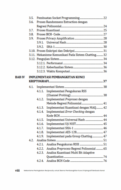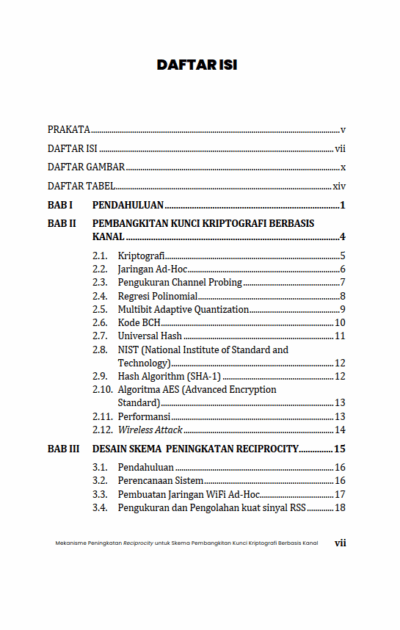 Berikut Daftar Isi Buku Teknik Informatika yang berjudul Buku Mekanisme Peningkatan Reciprocity untuk Skema Pembangkitan Kunci Kriptografi Berbasis Kanal, diantaranya:
