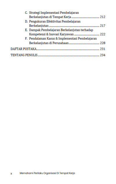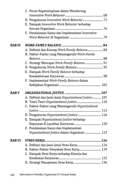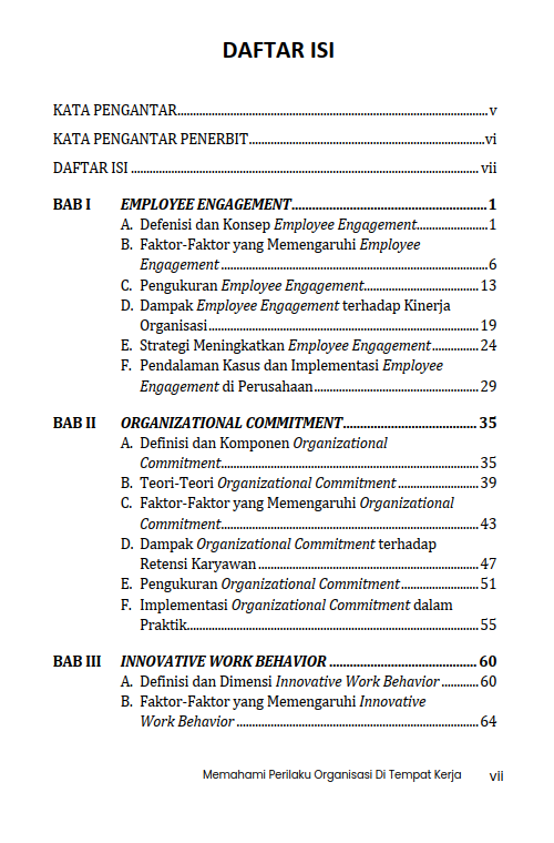 Dalam buku ini, pembaca akan diajak untuk menggali berbagai konsep penting seperti Employee engagement, Organizational commitment, Innovative Work Behavior, Work-Family Balance, Organizational Justice, dan berbagai topik lainnya yang relevan dengan perilaku organisasi. Setiap bab dirancang untuk memberikan wawasan teoretis yang kuat, didukung oleh pendalaman kasus dan implementasi nyata, yang diharapkan dapat memberikan gambaran yang lebih komprehensif mengenai aplikasi praktis dari teori-teori yang dibahas. Diharapkan buku ini dapat memberikan pemahaman mendalam tentang berbagai aspek perilaku organisasi yang memengaruhi efektivitas dan produktivitas dalam dunia kerja. Perilaku organisasi merupakan bidang studi yang terus berkembang, dan memahami dinamika yang ada di dalamnya sangat penting bagi para praktisi, akademisi, dan siapa saja yang tertarik untuk memahami bagaimana individu dan kelompok berinteraksi dalam sebuah organisasi.