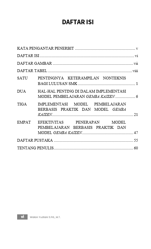 Berikut Daftar Isi Buku Pendidikan berjudul Buku Memupuk Karakter Industri di SMK dengan Model Gemba Kaizen, diantaranya: