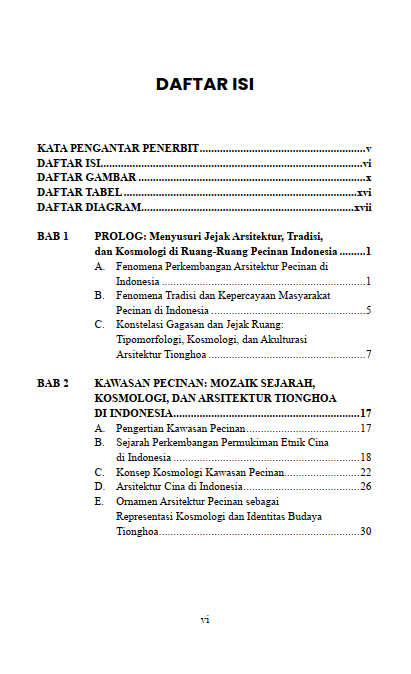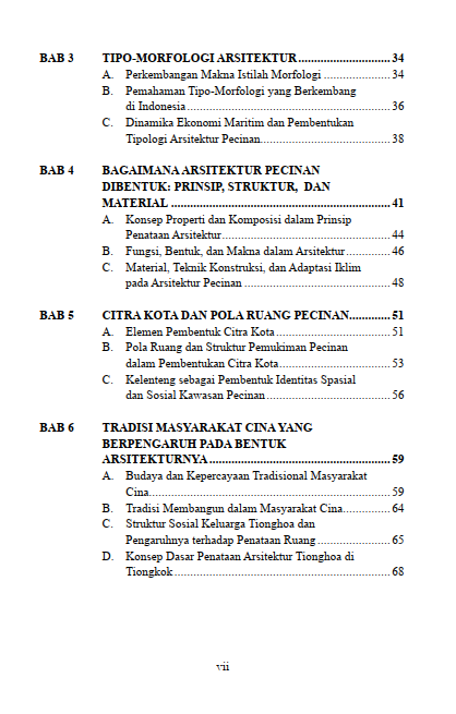 Buku ini juga mengajak pembaca menelusuri jejak arsitektur Pecinan di Indonesia sebagai lanskap kultural yang sarat makna dan simbol. Melalui perpaduan teori arsitektur, tipomorfologi, dan kajian kosmologi Tionghoa, pembaca diajak memahami bahwa setiap bentuk atap, arah hadap rumah, dan susunan ruang tidak pernah netral, melainkan wujud dialog panjang antara keyakinan, adaptasi, dan sejarah migrasi.