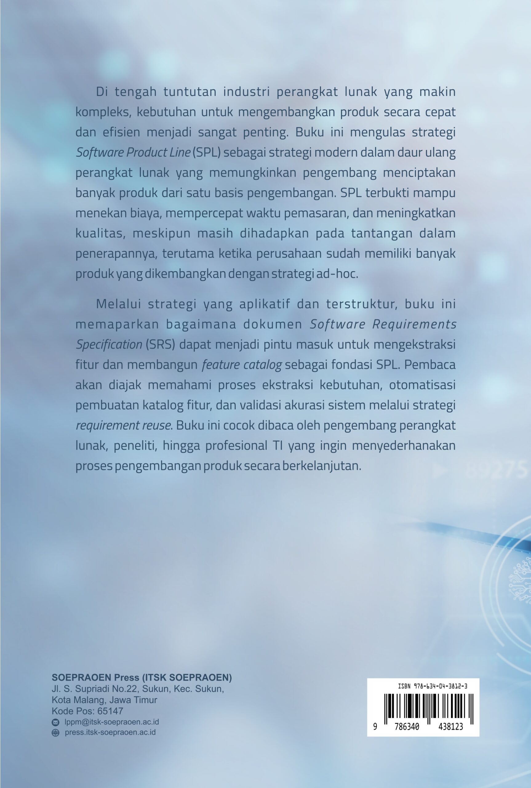 Melalui strategi yang aplikatif dan terstruktur, buku ini memaparkan bagaimana dokumen Software Requirements Specification (SRS) dapat menjadi pintu masuk untuk mengekstraksi fitur dan membangun feature catalog sebagai fondasi SPL. Pembaca akan diajak memahami proses ekstraksi kebutuhan, otomatisasi pembuatan katalog fitur, dan validasi akurasi sistem melalui strategi requirement reuse. Buku Menambang Fitur dari Dokumen Spesifikasi Kebutuhan Perangkat Lunak sangat cocok dibaca oleh pengembang perangkat lunak, peneliti, hingga profesional TI yang ingin menyederhanakan proses pengembangan produk secara berkelanjutan.