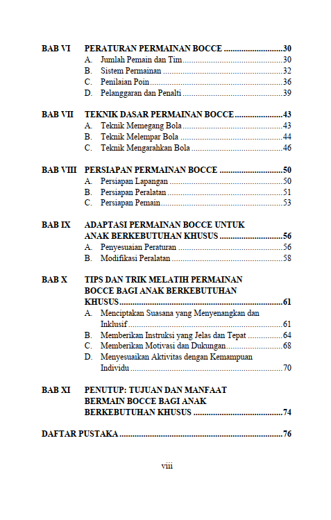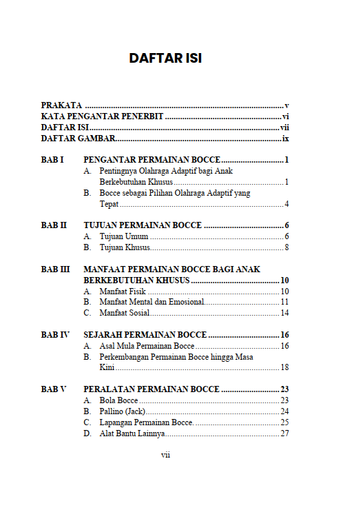 Berikut Daftar Isi Buku Olahraga yang berjudul Buku Mengenal dan Menguasai Teknik Permainan Bocce, diantaranya: