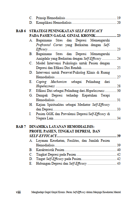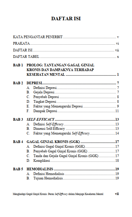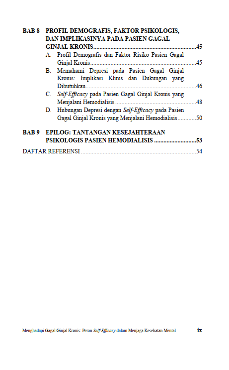 Buku ini mengeksplorasi hubungan antara gagal ginjal kronis, kesehatan mental, dan harapan. Bagaimana pasien bisa menemukan kekuatan untuk terus menjalani hari-hari mereka? Sejauh mana dukungan dari keluarga, tenaga kesehatan, dan sistem layanan medis berperan dalam membangun ketahanan mental? Dengan pemahaman yang lebih mendalam tentang dinamika psikologis pasien hemodialisis, buku ini diharapkan dapat menjadi panduan bagi pasien, keluarga, serta tenaga medis dalam menghadapi tantangan yang ada dan meningkatkan kesejahteraan mereka. Berikut Daftar Isi Buku Keperawatan yang berjudul Buku Menghadapi Gagal Ginjal Kronis: Peran Self-Efficacy dalam Menjaga Kesehatan Mental, diantaranya: