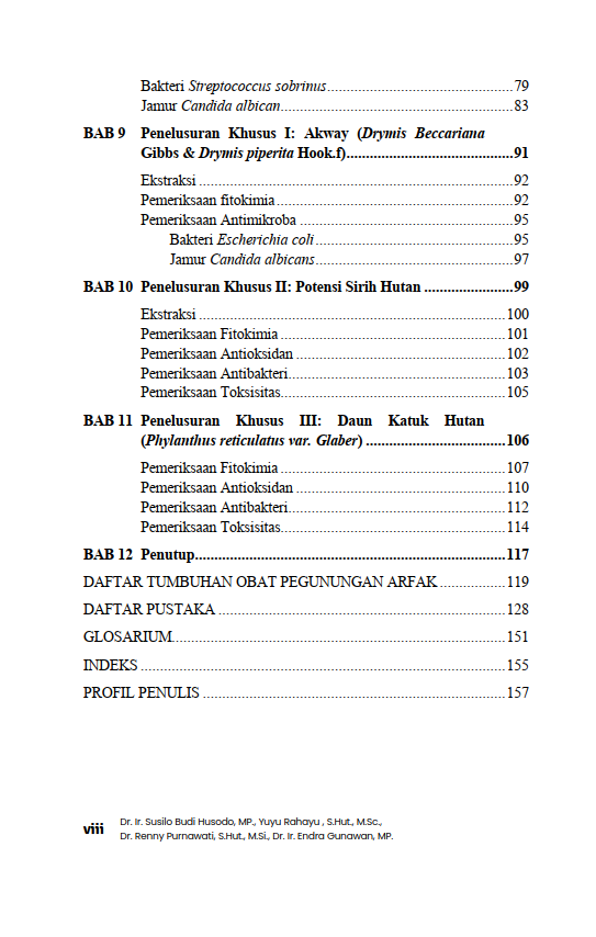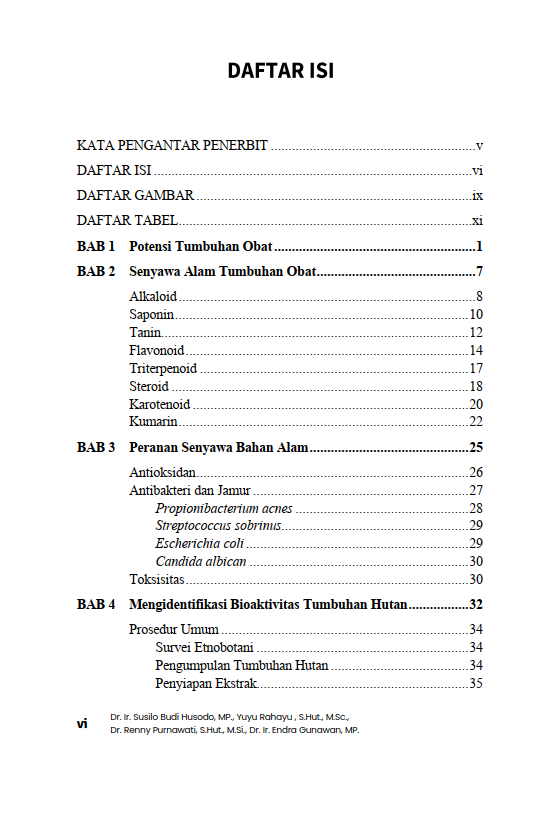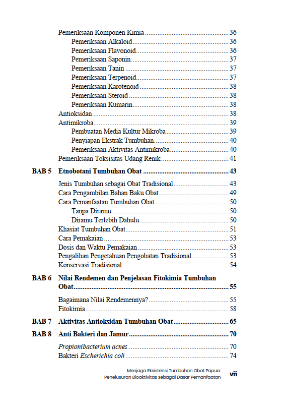 Berikut Daftar Isi Buku Kehutanan yang berjudul Buku Buku Menjaga Eksistensi Tumbuhan Obat Papua: Penelusuran Bioaktivitas sebagai Dasar Pemanfaatan, diantaranya: