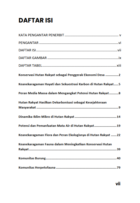 Berikut Daftar Isi Buku Kehutanan yang berjudul Buku Menjaga Hutan Rakyat Sebagai Sumber Kehidupan dan Keanekaragaman Hayati untuk Masa Depan, diantaranya: