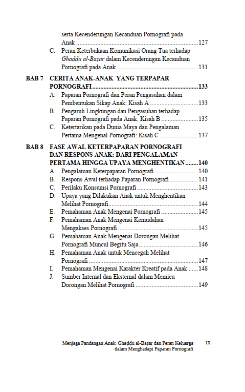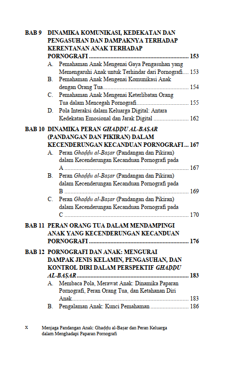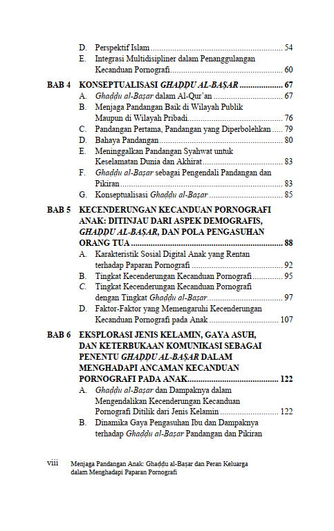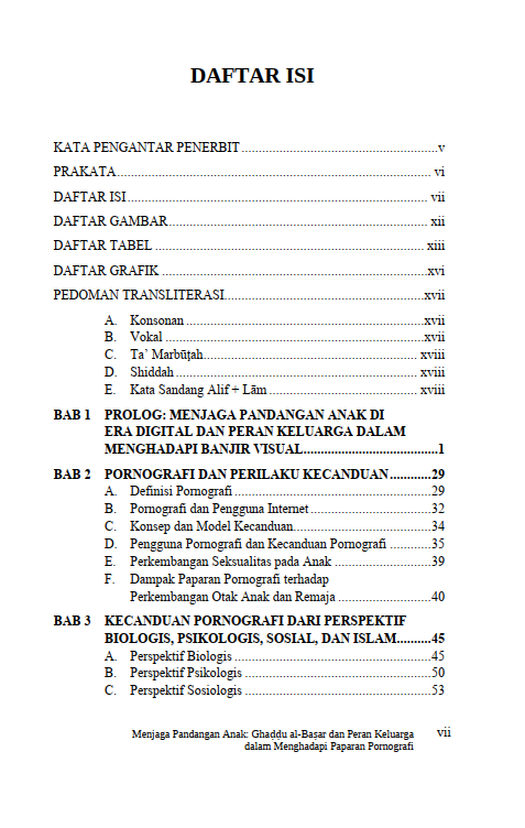 Lebih dari sekadar wacana, buku ini adalah ajakan reflektif bagi keluarga untuk menjadi garda terdepan dalam menjaga hati dan pandangan generasi penerus dari tsunami informasi di dunia digital. Buku Menjaga Pandangan Anak: Ghaḍḍu al-Baṣar dan Peran Keluarga dalam Menghadapi Paparan Pornografi sangat cocok bagi pembaca terlebih para orang tua yang sedang mencari tau bagaimana menerapkan menjaga pandangan untuk anak. Berikut Daftar Isi Buku Agama Islam yang berjudul Buku Menjaga Pandangan Anak: Ghaḍḍu al-Baṣar dan Peran Keluarga dalam Menghadapi Paparan Pornografi, diantaranya: