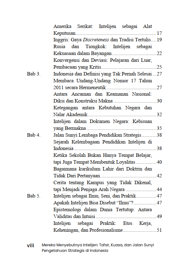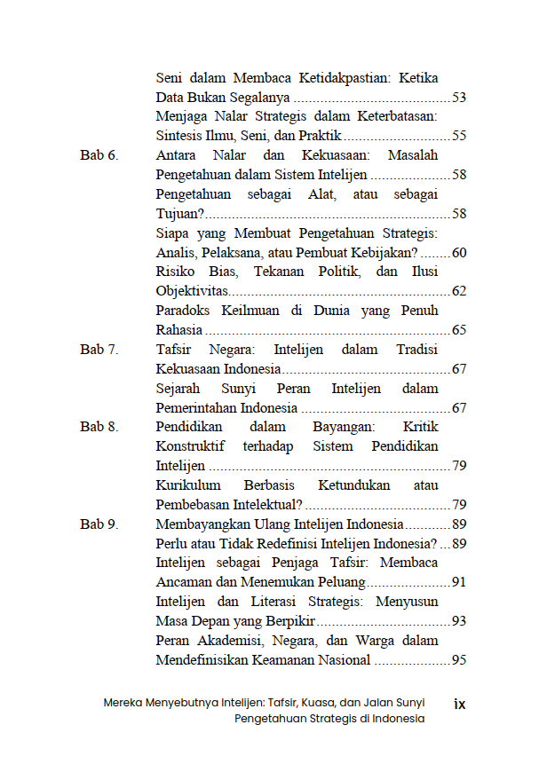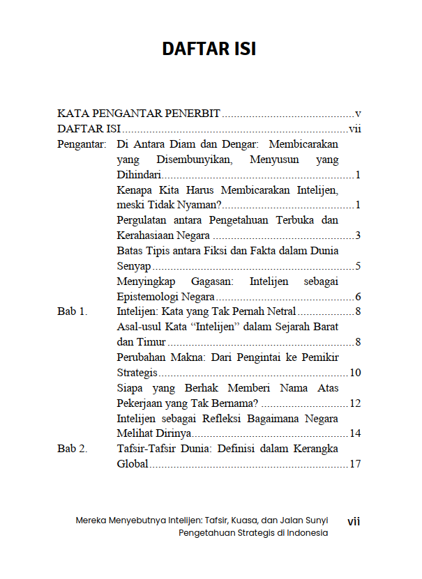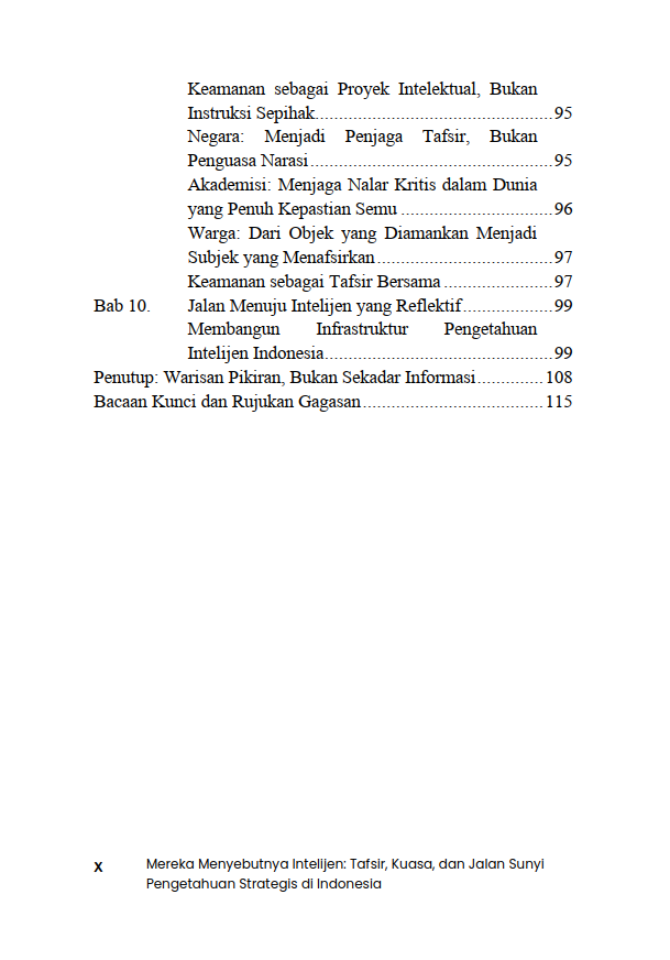 Berikut Daftar Isi Buku Ilmu Pemerintahan berjudul Mereka Menyebutnya Intelijen: Tafsir, Kuasa, dan Jalan Sunyi Pengetahuan Strategis di Indonesia, diantaranya: