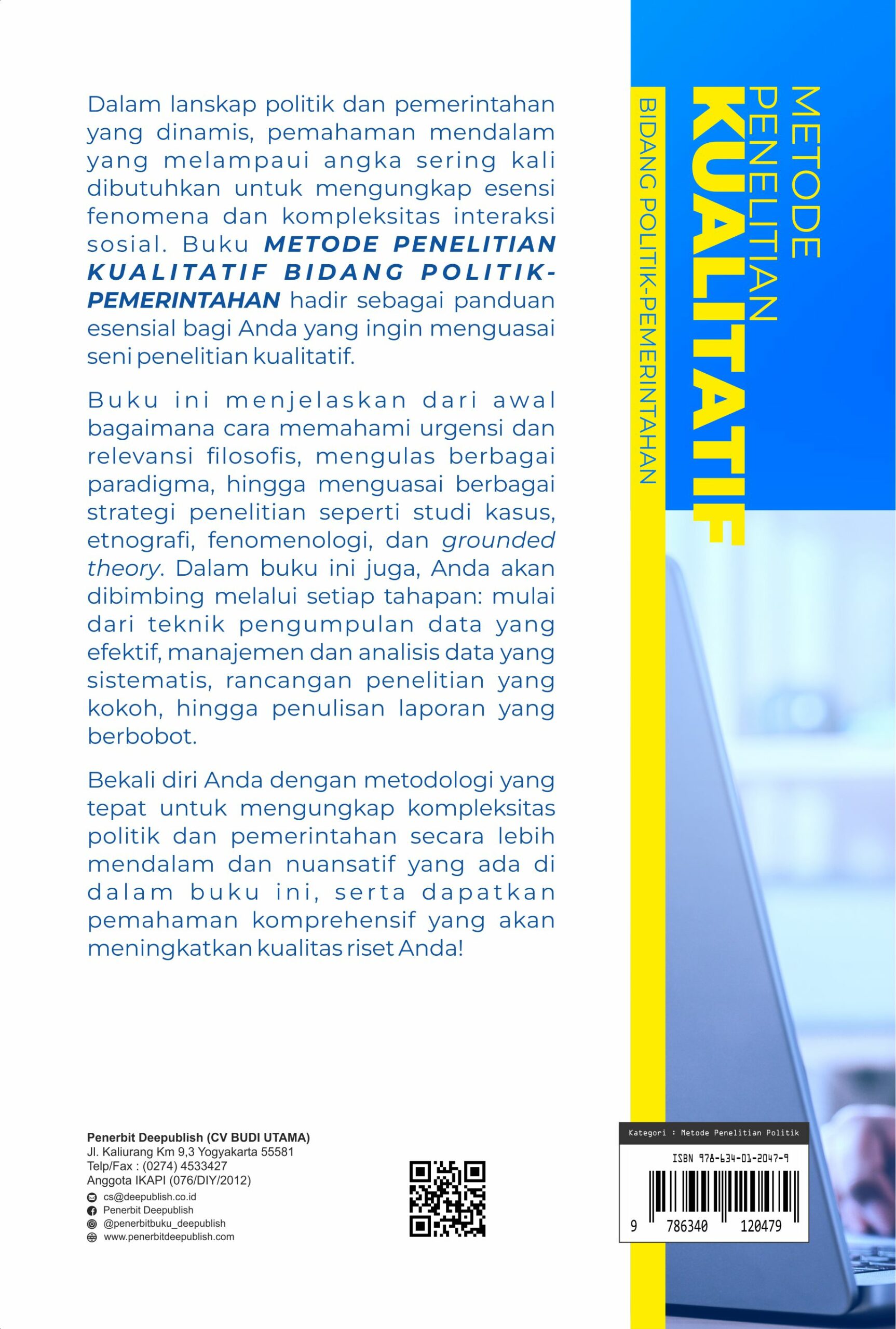 Buku Metode Penelitian Kualitatif Bidang Politik-Pemerintahan diterbitkan oleh Penerbit Buku Pendidikan Deepublish.