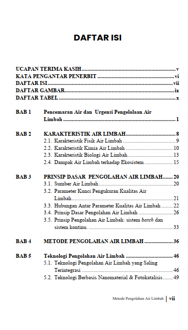 Buku “Metode Pengolahan Air Limbah” menghadirkan pembahasan komprehensif tentang prinsip, teknik, dan tahapan dalam pengolahan air limbah. Pembaca akan diperkenalkan pada berbagai metode pengolahan, mulai dari proses fisik seperti penyaringan dan sedimentasi, proses kimia seperti koagulasi dan netralisasi, hingga proses biologis seperti sistem lumpur aktif dan biofilter. Selain itu, buku ini juga mengulas inovasi teknologi terkini, seperti penggunaan membran filtrasi, bioreaktor anaerob, dan metode fitoremediasi yang ramah lingkungan.
