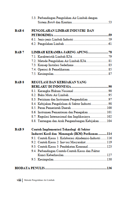 Tidak hanya membahas aspek teknis, buku ini juga menyoroti pentingnya peraturan dan kebijakan lingkungan dalam pengelolaan limbah cair, serta strategi penerapan sistem pengolahan di berbagai sektor. Dengan uraian yang sistematis dan mudah dipahami, buku ini menjadi referensi penting bagi mahasiswa, peneliti, praktisi lingkungan, maupun pengambil kebijakan yang berkomitmen terhadap pengelolaan air berkelanjutan.