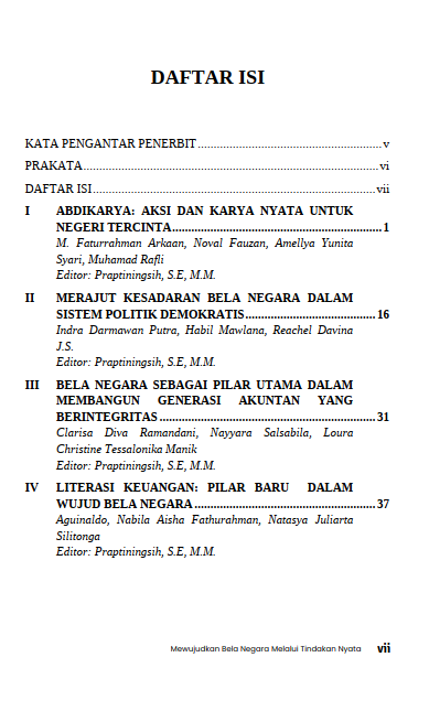 Berikut Daftar Isi Buku Sosial dan Politik yang berjudul Buku Mewujudkan Bela Negara Melalui Tindakan Nyata, diantaranya:
