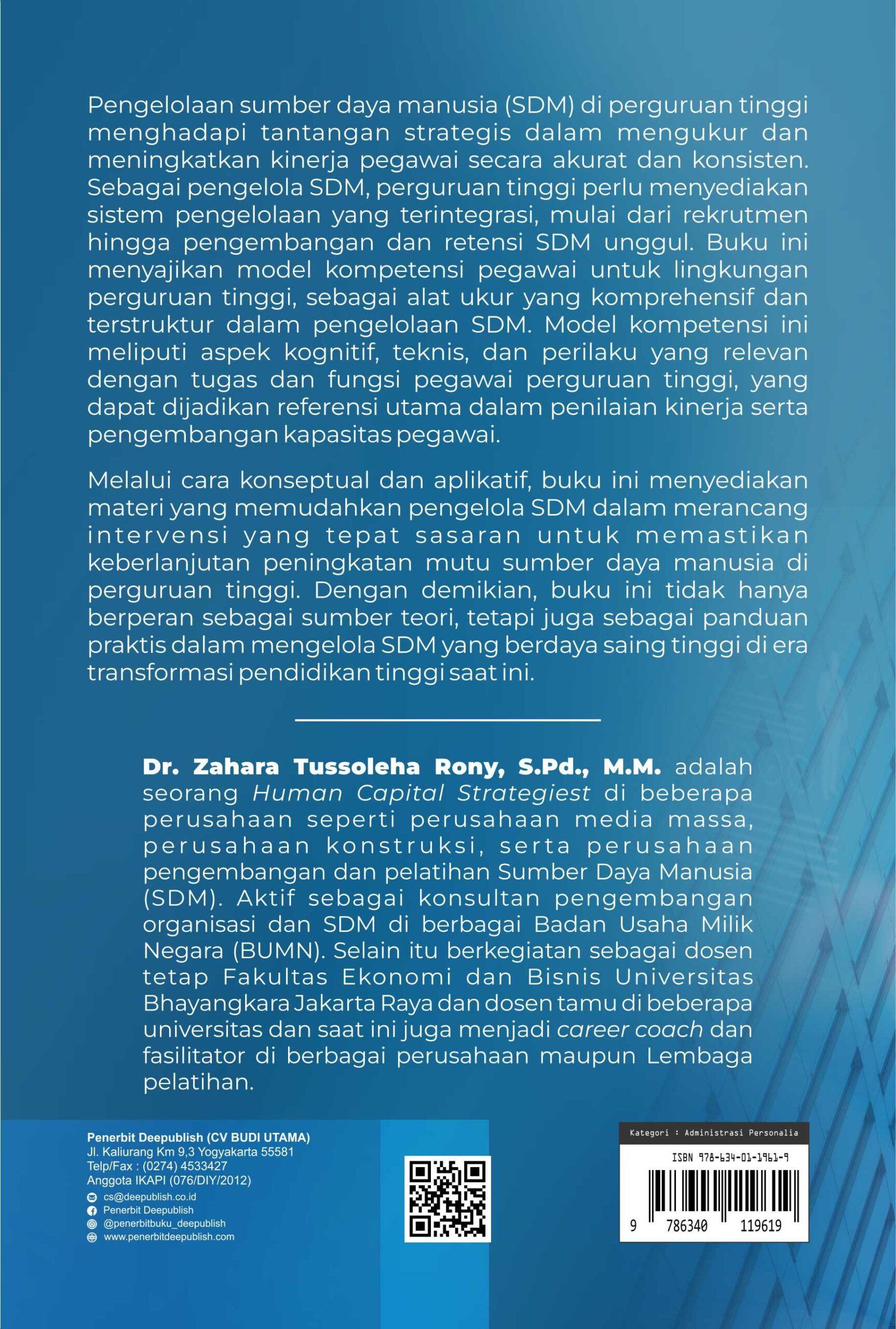 Buku Manajemen SDM yang berjudul Buku Model Kompetensi Perguruan Tinggi merupakan karya Zahara Tussoleha Rony. Pengelolaan sumber daya manusia (SDM) di perguruan tinggi menghadapi tantangan strategis dalam mengukur dan meningkatkan kinerja pegawai secara akurat dan konsisten. Sebagai pengelola SDM, perguruan tinggi perlu menyediakan sistem pengelolaan yang terintegrasi, mulai dari rekrutmen hingga pengembangan dan retensi SDM unggul. Model kompetensi yang diterapkan oleh perguruan tinggi merupakan seperangkat kemampuan yang perlu dimiliki oleh setiap pegawai guna mendukung pencapaian kinerja yang unggul. Dengan demikian, model kompetensi tersebut mencakup berbagai jenis kompetensi beserta definisi, tingkat kemahiran, serta profil kompetensi yang disesuaikan dengan masing-masing jabatan yang ada di lingkungan perguruan tinggi. Buku ini menyajikan model kompetensi pegawai untuk lingkungan perguruan tinggi, sebagai alat ukur yang komprehensif dan terstruktur dalam pengelolaan SDM. Model kompetensi ini meliputi aspek kognitif, teknis, dan perilaku yang relevan dengan tugas dan fungsi pegawai perguruan tinggi, yang dapat dijadikan referensi utama dalam penilaian kinerja serta pengembangan kapasitas pegawai.