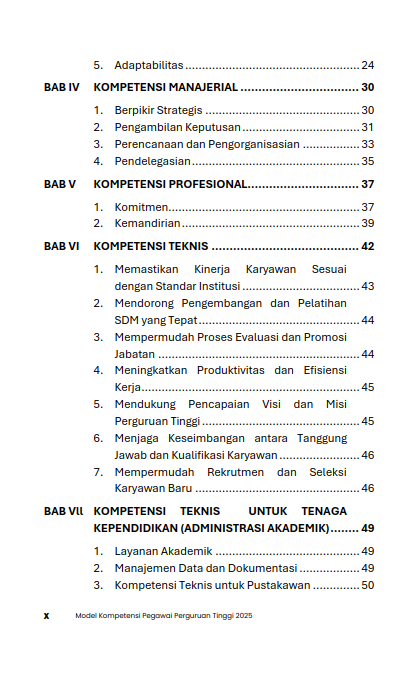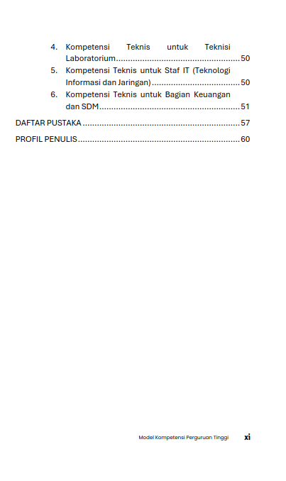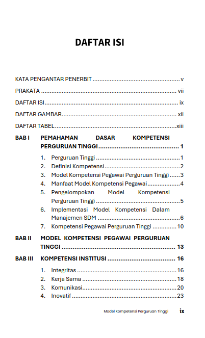 Pengelolaan sumber daya manusia (SDM) di perguruan tinggi menghadapi tantangan strategis dalam mengukur dan meningkatkan kinerja pegawai secara akurat dan konsisten. Sebagai pengelola SDM, perguruan tinggi perlu menyediakan sistem pengelolaan yang terintegrasi, mulai dari rekrutmen hingga pengembangan dan retensi SDM unggul. Buku ini menyajikan model kompetensi pegawai untuk lingkungan perguruan tinggi, sebagai alat ukur yang komprehensif dan terstruktur dalam pengelolaan SDM. Model kompetensi ini meliputi aspek kognitif, teknis, dan perilaku yang relevan dengan tugas dan fungsi pegawai perguruan tinggi, yang dapat dijadikan referensi utama dalam penilaian kinerja serta pengembangan kapasitas pegawai.
