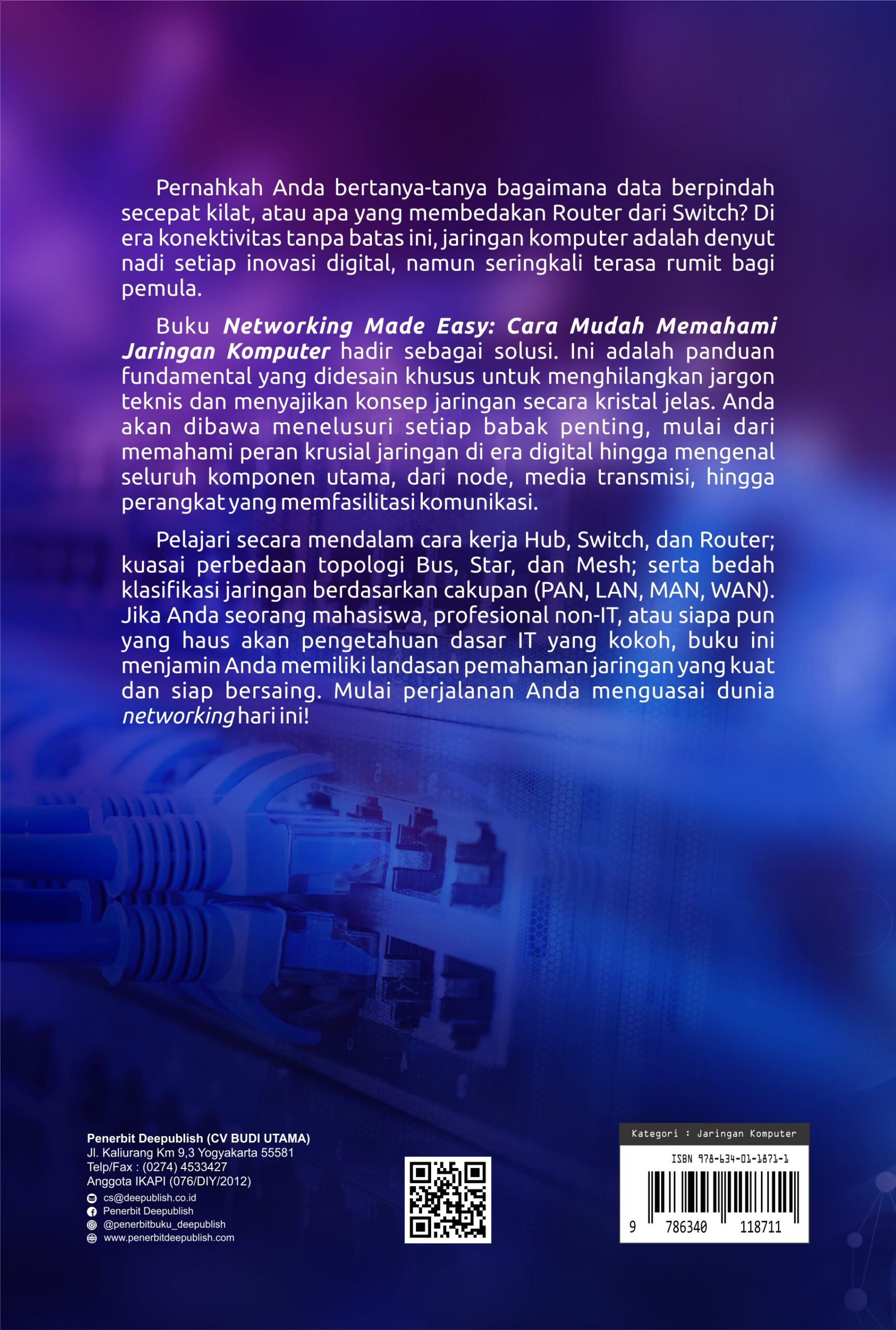 Buku Ilmu Komputer yang berjudul Buku Networking Made Easy: Cara Mudah Memahami Jaringan Komputer merupakan karya Refan Surya Putra. Pernahkah Anda bertanya-tanya bagaimana data berpindah secepat kilat, atau apa yang membedakan Router dari Switch? Di era konektivitas tanpa batas ini, jaringan komputer adalah denyut nadi setiap inovasi digital, namun seringkali terasa rumit bagi pemula. Pada intinya, jaringan komputer adalah sebuah sistem yang terdiri dari dua atau lebih entitas komputasi otonom yang dihubungkan melalui media transmisi dan diatur oleh serangkaian aturan (protokol) untuk memungkinkan komunikasi dan berbagi sumber daya secara efisien.  Di era digital, jaringan komputer bukanlah lagi sebuah kemewahan, melainkan infrastruktur krusial yang setara dengan listrik dan air bersih. Ketiadaannya akan melumpuhkan ekonomi global, memutus hubungan sosial, dan menghambat kemajuan ilmu pengetahuan.