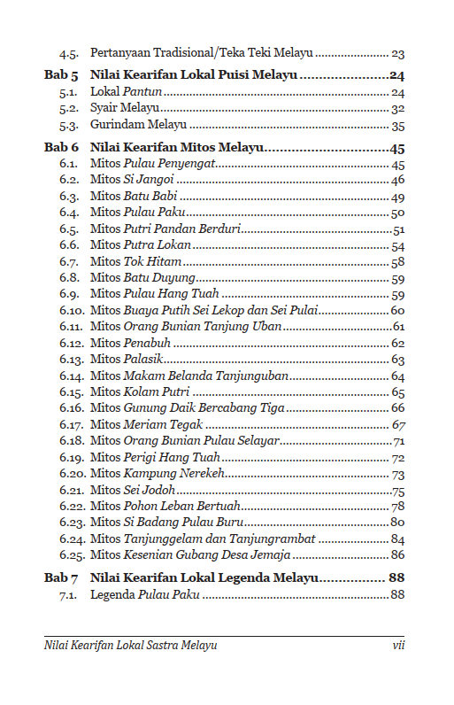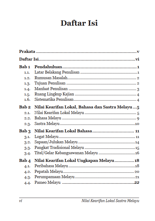 Sinopsis Buku Nilai Kearifan Lokal Sastra Melayu Buku Nilai Kearifan Lokal Sastra Melayu Buku Sosial Budaya yang berjudul Buku Nilai Kearifan Lokal Sastra Melayu merupakan karya Suhardi. Buku ini mengulas tentang bentuk dan keragaman folklor yang dimiliki masyarakat Melayu Provinsi Kepulauan Riau. Mulai dari yang berbentuk lisan, sebagian lisan, hingga yang berbentuk bukan lisan. Folklor Lisan, meliputi: bahasa rakyat (meliputi: logat, julukan, pangkat tradisional, dan titel kebangsawanan), ungkapan tradisional (meliputi: peribahasa, pepatah, pameo), pertanyaan tradisional/teka-teki, puisi rakyat (meliputi: pantun, gurindam, dan syair), dan prosa rakyat (meliputi mitos dan legenda). Folklor Sebagian Lisan, meliputi: kepercayaan rakyat, permainan rakyat, teater rakyat, tarian rakyat, seni tradisional, adat-istiadat, dan upacara adat. Folklor Bukan Lisan, meliputi: berbentuk material dan bukan material. Yang berbentuk material, meliputi: arsitektur rakyat (ukiran rumah adat Melayu), kerajinan rakyat (Batik Gonggong, Tudung Manto, Kain Dagang), pakaian adat, makanan rakyat, minuman rakyat, dan obat-obatan tradisonal. Buku ini lebih lengkap menyajikan berbagai bentuk folklor Melayu, khususnya berbagai bentuk dan keragaman folklor yang ada dalam masyarakat Melayu Kepulauan Riau. Dengan demikian, pembaca akan lebih kaya pengetahuannya setelah membaca buku ini. Berikut Daftar Isi Buku Sosial Budaya yang berjudul Buku Nilai Kearifan Lokal Sastra Melayu, diantaranya: