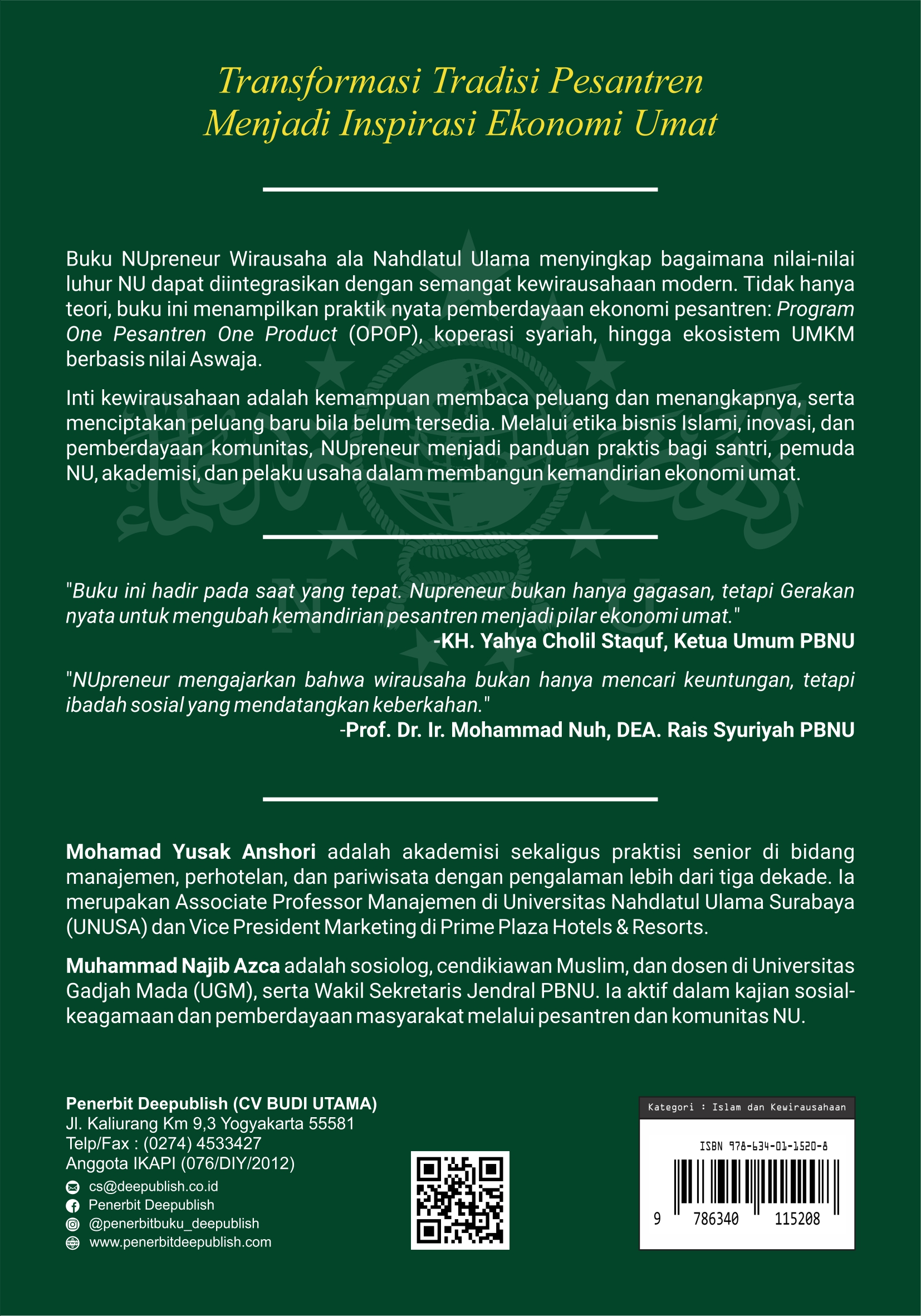 Buku ini menghadirkan konsep kewirausahaan yang berakar pada nilai-nilai NU, sekaligus menjadi panduan praktis dalam menggerakkan ekonomi umat berbasis spiritualitas. Buku ini menyingkap bagaimana nilai-nilai luhur NU dapat diintegrasikan dengan semangat kewirausahaan modern. Tidak hanya teori, buku ini menampilkan praktik nyata pemberdayaan ekonomi pesantren: program One Pesantren One Product (OPOP), koperasi syariah, hingga ekosistem UMKM berbasis nilai Aswaja. Inti kewirausahaan adalah kemampuan membaca peluang dan menangkapnya, serta menciptakan peluang baru bila belum tersedia. Melalui etika bisnis islami, inovasi, dan pemberdayaan komunitas, NUpreneur menjadi panduan praktis bagi santri, pemuda NU, akademisi, dan pelaku usaha dalam membangun kemandirian ekonomi umat.