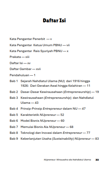 Berikut Daftar Isi Buku Ekonomi Islam yang berjudul Buku NUpreneur Wirausaha Ala Nahdlatul Ulama, diantaranya:
