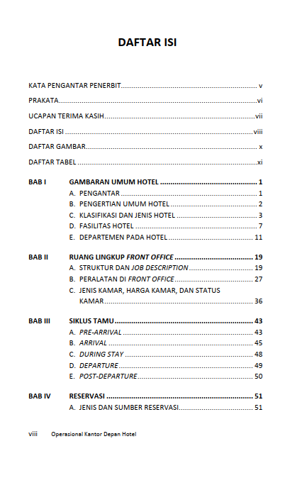 Untuk memaksimalkan pelayanan hotel, buku ini juga dilengkapi pembahasan tentang bagaimana cara berkoordinasi dengan berbagai departemen lain agar tercipta kerja sama yang solid. Buku ini menjadi bacaan yang tepat bagi siswa perhotelan, karyawan baru, maupun siapa saja yang ingin memahami dasar-dasar operasional kantor depan hotel secara menyeluruh.