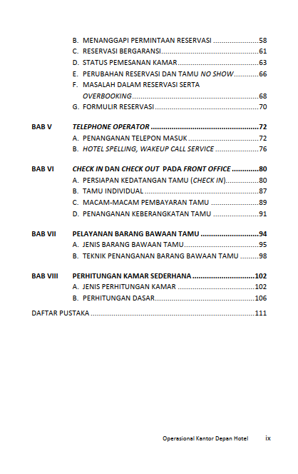 Dalam buku ini, Anda dapat menemukan pembahasan lengkap tentang struktur kerja kantor depan, peralatan yang digunakan, dan berbagai proses layanan yang terjadi setiap hari. Bagaimana cara menangani reservasi, menyambut tamu saat kedatangan, memastikan kebutuhan mereka terpenuhi selama menginap, hingga mengatur keberangkatan dengan rapi.