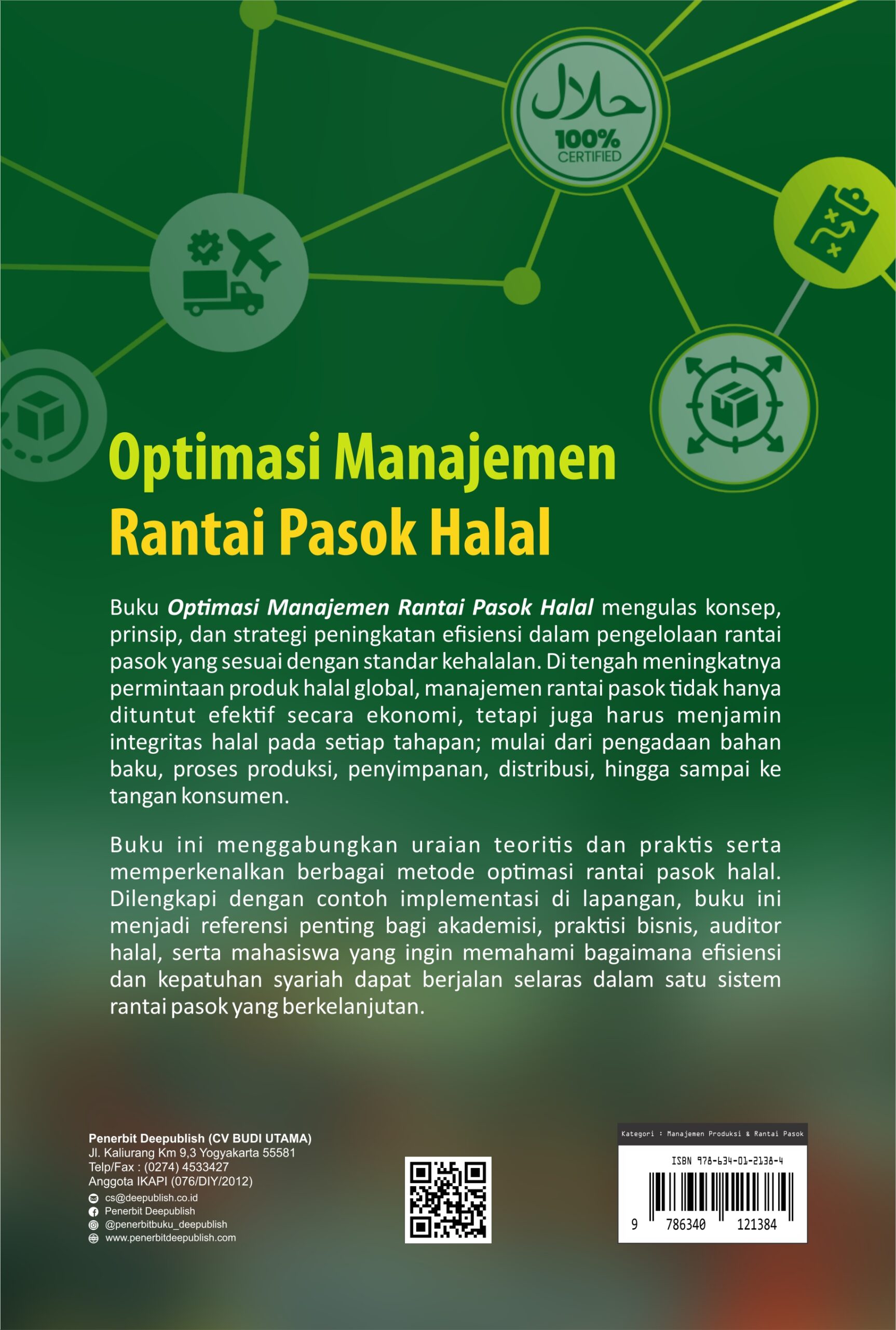 Buku Optimasi Manajemen Rantai Pasok Halal diterbitkan oleh Penerbit Buku Pendidikan Deepublish.