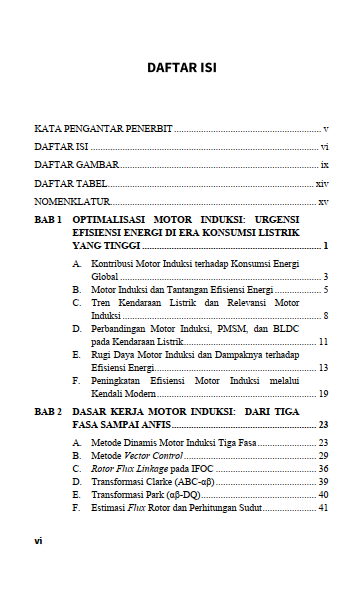 Berikut Daftar Isi Buku Teknik yang berjudul Buku Optimasi Motor Induksi Tiga Fasa: dari Teori FOC Hingga Implementasi Anfis Real-Time, diantaranya: