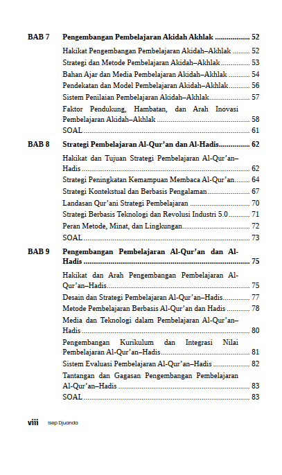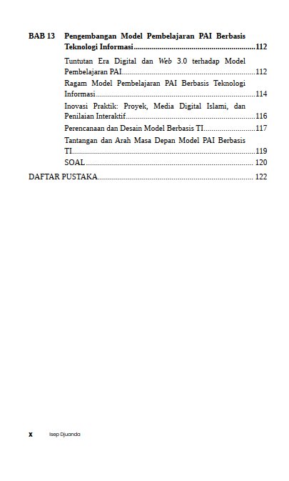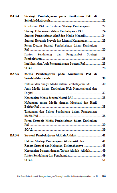 Akidah Akhlak, Al-Qur’an dan Al-Hadis, Fikih, serta Sejarah Kebudayaan Islam dibahas dengan sudut pandang yang aplikatif sehingga nilai-nilai Islam tidak berhenti pada tataran wacana. Peran guru ditampilkan sebagai perancang pembelajaran yang peka terhadap karakter peserta didik, mampu mengelola interaksi kelas, dan cermat memilih cara penyampaian materi agar pesan keislaman dapat dipahami dan dihayati. Bagian akhir buku ini menaruh perhatian besar pada pemanfaatan teknologi informasi dalam pembelajaran PAI. Media digital dipandang sebagai sarana untuk memperkaya pengalaman belajar, memperluas sumber pengetahuan, dan menjaga relevansi PAI di abad ke-21.