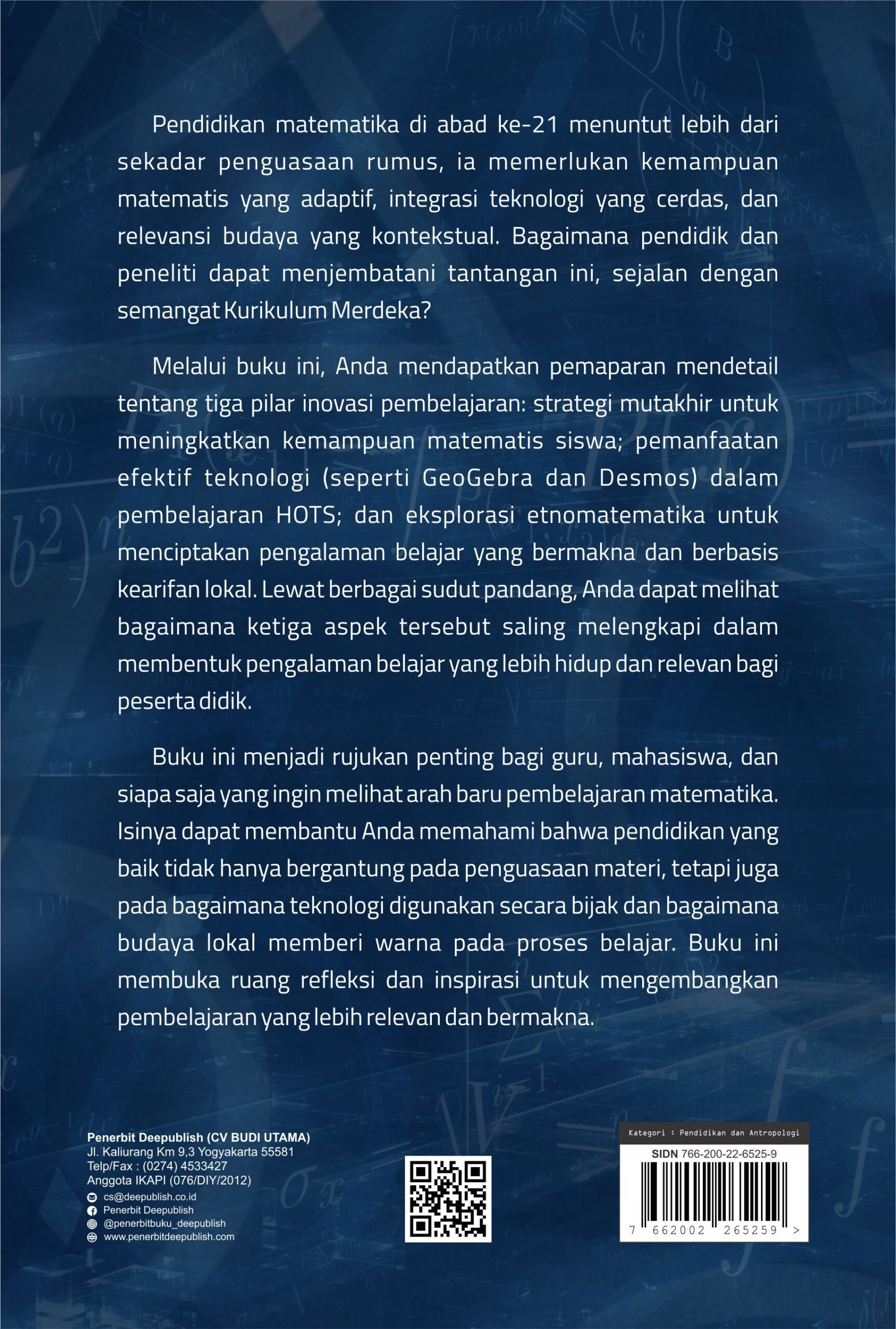Melalui buku ini, Anda mendapatkan pemaparan mendetail tentang tiga pilar inovasi pembelajaran: strategi mutakhir untuk meningkatkan kemampuan matematis siswa; pemanfaatan efektif teknologi (seperti GeoGebra dan Desmos) dalam pembelajaran HOTS; dan eksplorasi etnomatematika untuk menciptakan pengalaman belajar yang bermakna dan berbasis kearifan lokal. Lewat berbagai sudut pandang, Anda dapat melihat bagaimana ketiga aspek tersebut saling melengkapi dalam membentuk pengalaman belajar yang lebih hidup dan relevan bagi peserta didik.