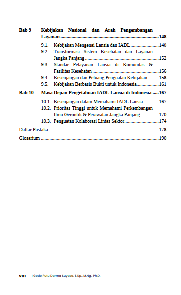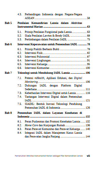 Pemenuhan kebutuhan aktivitas instrumental harian (Instrumental Activities of Daily Living/IADL) pada lansia menjadi isu penting seiring percepatan penuaan penduduk dan meningkatnya kompleksitas tantangan dalam mempertahankan kemandirian serta kualitas hidup. Perubahan demografis ini menuntut pemahaman yang komprehensif, berbasis bukti, dan kontekstual terhadap kondisi lansia, khususnya dalam menjalankan aktivitas instrumental sehari-hari. Buku ini menghadirkan landasan konseptual, empiris, dan praktis mengenai pemenuhan IADL pada lansia di Indonesia dengan menempatkan IADL sebagai indikator utama kemandirian, kesejahteraan, dan penuaan sehat. Disajikan pula pandangan tentang pentingnya mengintegrasikan perspektif kesehatan, sosial, budaya, dan kebijakan untuk mendorong praktik pelayanan dan perumusan kebijakan yang lebih holistik dan berkelanjutan. Melalui pemahaman lintas disiplin, buku ini diharapkan dapat menjadi rujukan strategis bagi akademisi, praktisi, dan pemangku kepentingan dalam merancang intervensi yang berorientasi pada pemberdayaan serta pemeliharaan martabat lansia.