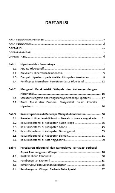 Berikut Daftar Isi Buku Kesehatan berjudul Buku Pemetaan Hipertensi: Sebuah Strategi Spasial untuk Intervensi Kesehatan, diantaranya: