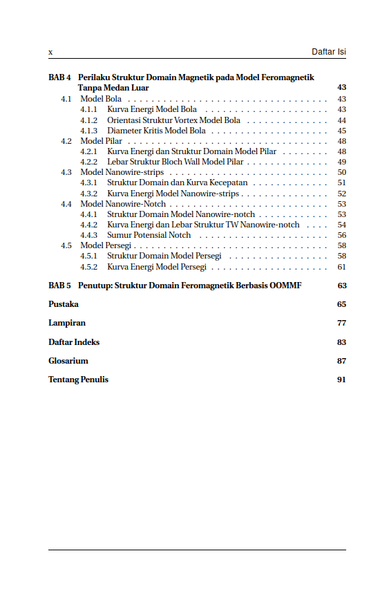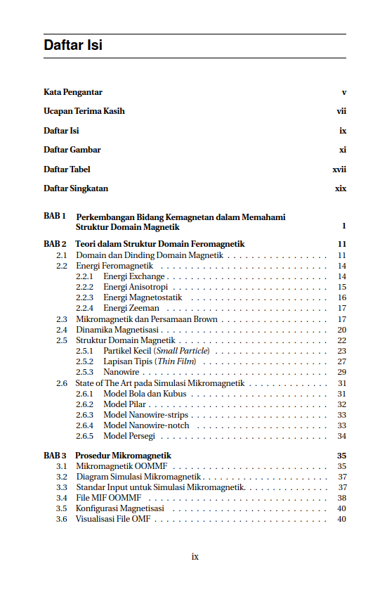 Berikut Daftar Isi Buku FIsika yang berjudul Buku Pemodelan Struktur Domain Feromagnetik Keadaan Tanpa Medan Luar Menggunakan Mikromagnetik Oommf, diantaranya:
