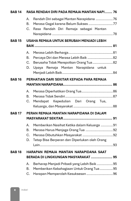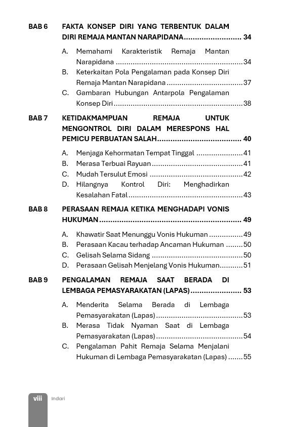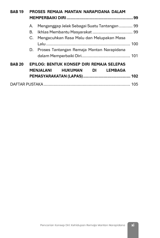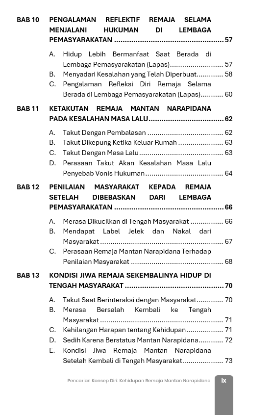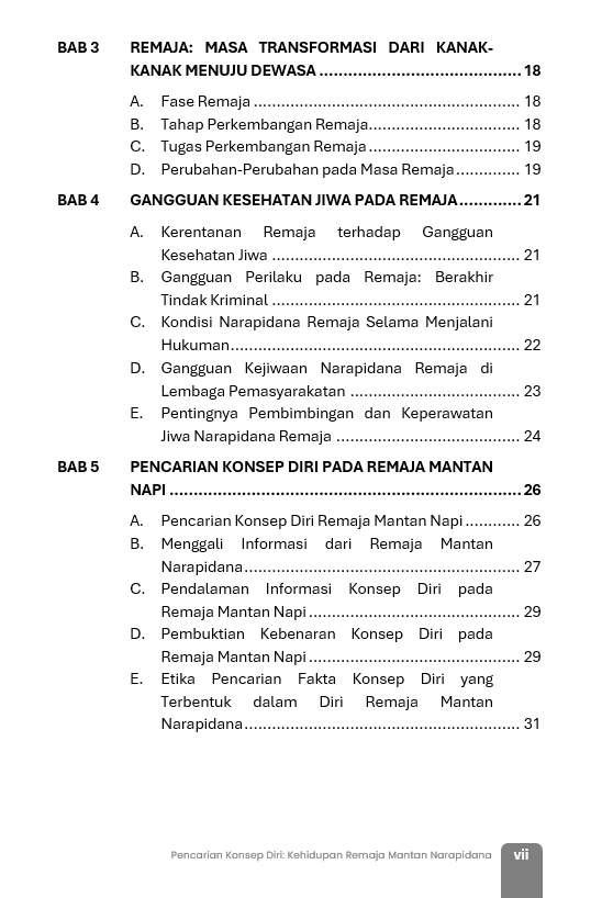 Berikut Daftar Isi Buku Psikologi yang berjudul Buku Pencarian Konsep Diri: Kehidupan Remaja Mantan Narapidana, diantaranya:
